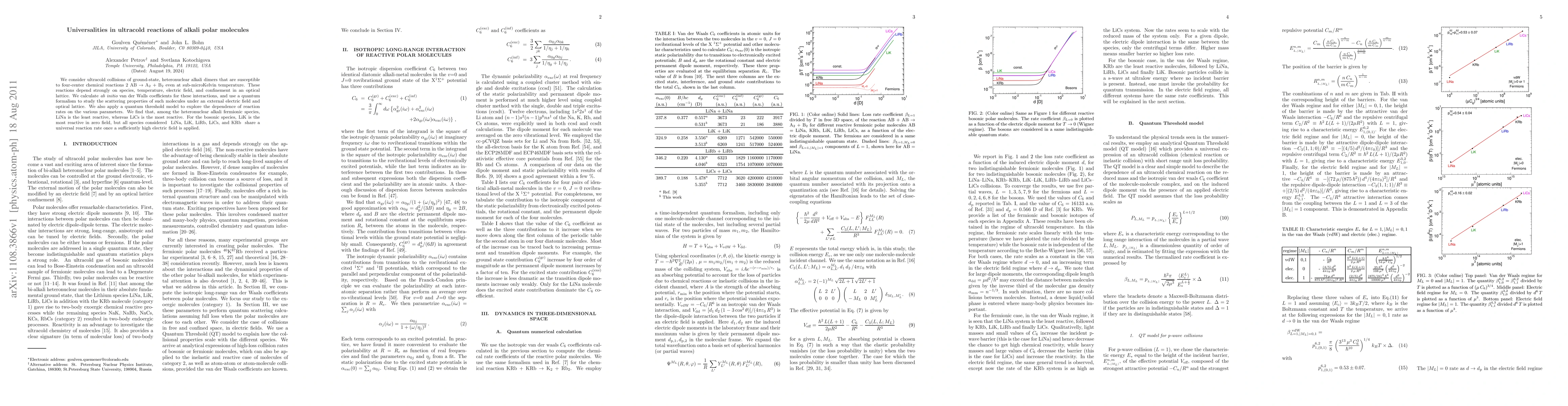We consider ultracold collisions of ground-state, heteronuclear alkali dimers that are susceptible to four-center chemical reactions 2 AB -> A2 + B2 even at sub-microKelvin temperature. These reactions depend strongly on species, temperature, electric field, and confinement in an optical lattice. We calculate ab initio van der Walls coefficients for these interactions, and use a quantum formalism to study the scattering properties of such molecules under an external electric field and optical lattice. We also apply a quantum threshold model to explore the dependence of reaction rates on the various parameters. We find that, among the heteronuclear alkali fermionic species, LiNa is the least reactive, whereas LiCs is the most reactive. For the bosonic species, LiK is the most reactive in zero field, but all species considered - LiNa, LiK, LiRb, LiCs, and KRb - share a universal reaction rate once a sufficiently high electric field is applied.