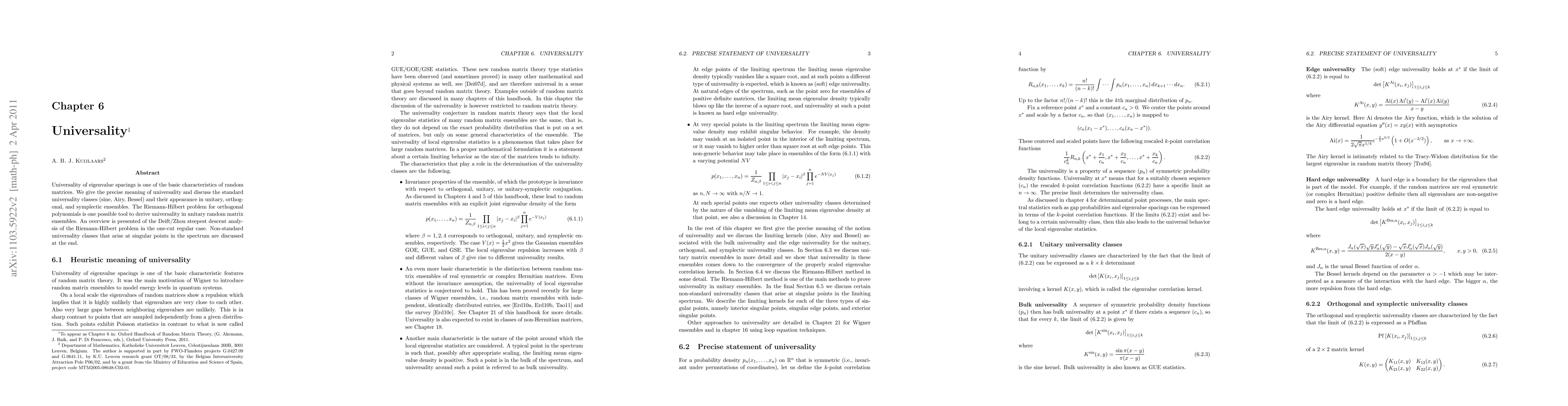 Universality of eigenvalue spacings is one of the basic characteristics of random matrices. We give the precise meaning of universality and discuss the standard universality classes (sine, Airy, Bessel) and their appearance in unitary, orthogonal, and symplectic ensembles. The Riemann-Hilbert problem for orthogonal polynomials is one possible tool to derive universality in unitary random matrix ensembles. An overview is presented of the Deift/Zhou steepest descent analysis of the Riemann-Hilbert problem in the one-cut regular case. Non-standard universality classes that arise at singular points in the spectrum are discussed at the end.