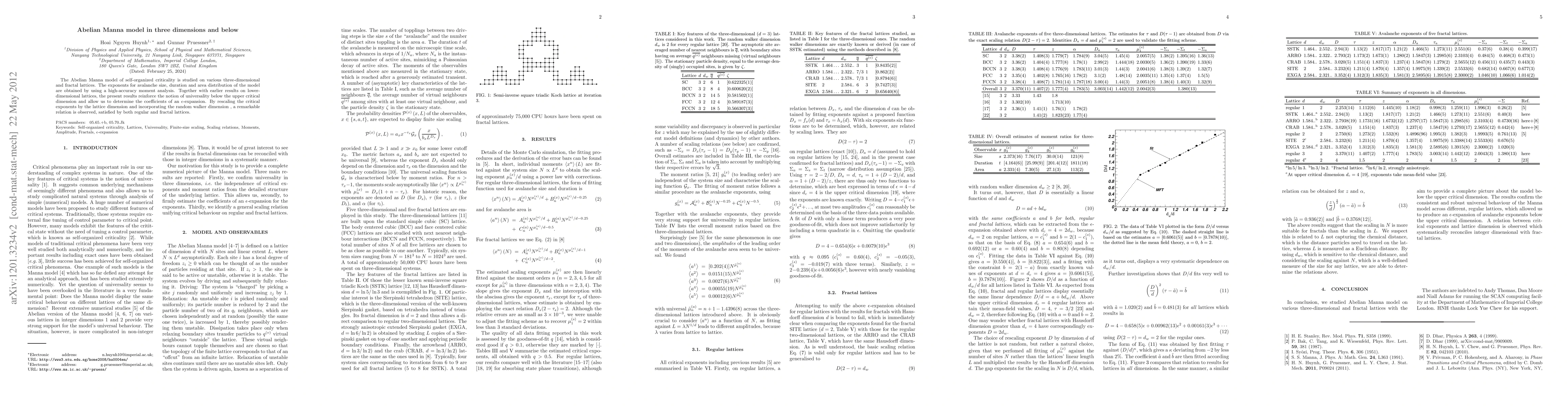 The Abelian Manna model of self-organized criticality is studied on various three-dimensional and fractal lattices. The exponents for avalanche size, duration and area distribution of the model are obtained by using a high-accuracy moment analysis. Together with earlier results on lower-dimensional lattices, the present results reinforce the notion of universality below the upper critical dimension and allow us to determine the the coefficients of an \epsilon-expansion. Rescaling the critical exponents by the lattice dimension and incorporating the random walker dimension, a remarkable relation is observed, satisfied by both regular and fractal lattices.