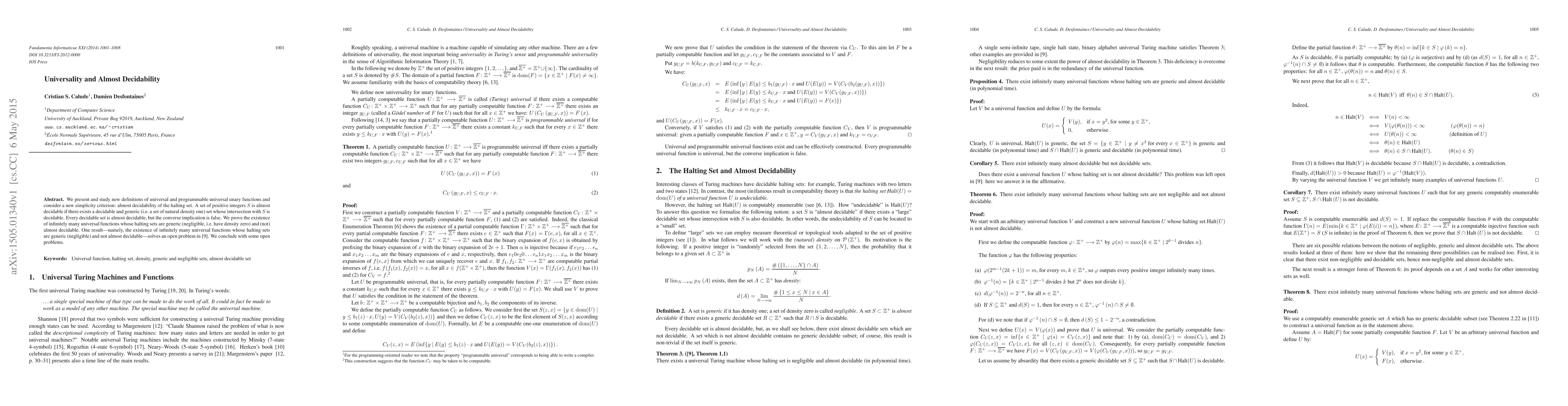 We present and study new definitions of universal and programmable universal unary functions and consider a new simplicity criterion: almost decidability of the halting set. A set of positive integers S is almost decidable if there exists a decidable and generic (i.e. a set of natural density one) set whose intersection with S is decidable. Every decidable set is almost decidable, but the converse implication is false. We prove the existence of infinitely many universal functions whose halting sets are generic (negligible, i.e. have density zero) and (not) almost decidable. One result - namely, the existence of infinitely many universal functions whose halting sets are generic (negligible) and not almost decidable - solves an open problem in [9]. We conclude with some open problems.