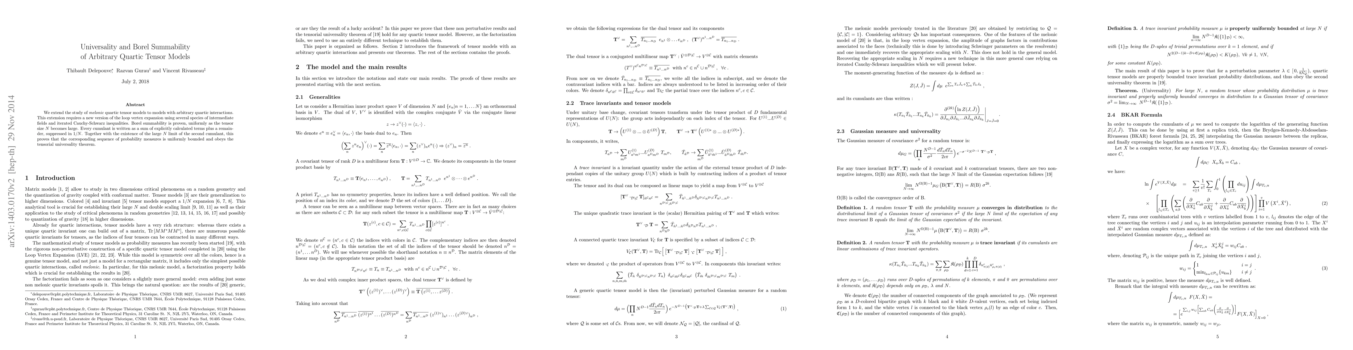 We extend the study of \emph{melonic} quartic tensor models to models with arbitrary quartic interactions. This extension requires a new version of the loop vertex expansion using several species of intermediate fields and iterated Cauchy-Schwarz inequalities. Borel summability is proven, uniformly as the tensor size $N$ becomes large. Every cumulant is written as a sum of explicitly calculated terms plus a remainder, suppressed in $1/N$. Together with the existence of the large $N$ limit of the second cumulant, this proves that the corresponding sequence of probability measures is uniformly bounded and obeys the tensorial universality theorem.