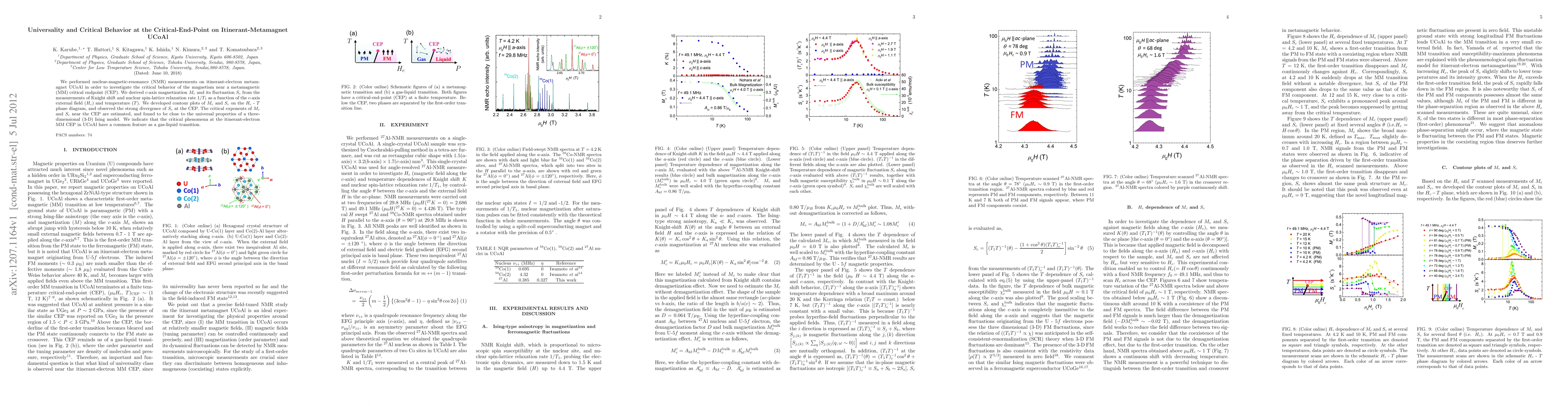We performed nuclear-magnetic-resonance (NMR) measurements on itinerant-electron metamagnet UCoAl in order to investigate the critical behavior of the magnetism near a metamagnetic (MM) critical endpoint (CEP). We derived c-axis magnetization $M_c$ and its fluctuation $S_c$ from the measurements of Knight shift and nuclear spin-lattice relaxation rate $1/T_1$ as a function of the c-axis external field ($H_c$) and temperature ($T$). We developed contour plots of $M_c$ and $S_c$ on the $H_c$ - $T$ phase diagram, and observed the strong divergence of $S_c$ at the CEP. The critical exponents of $M_c$ and $S_c$ near the CEP are estimated, and found to be close to the universal properties of a three-dimensional (3-D) Ising model. We indicate that the critical phenomena at the itinerant-electron MM CEP in UCoAl have a common feature as a gas-liquid transition.