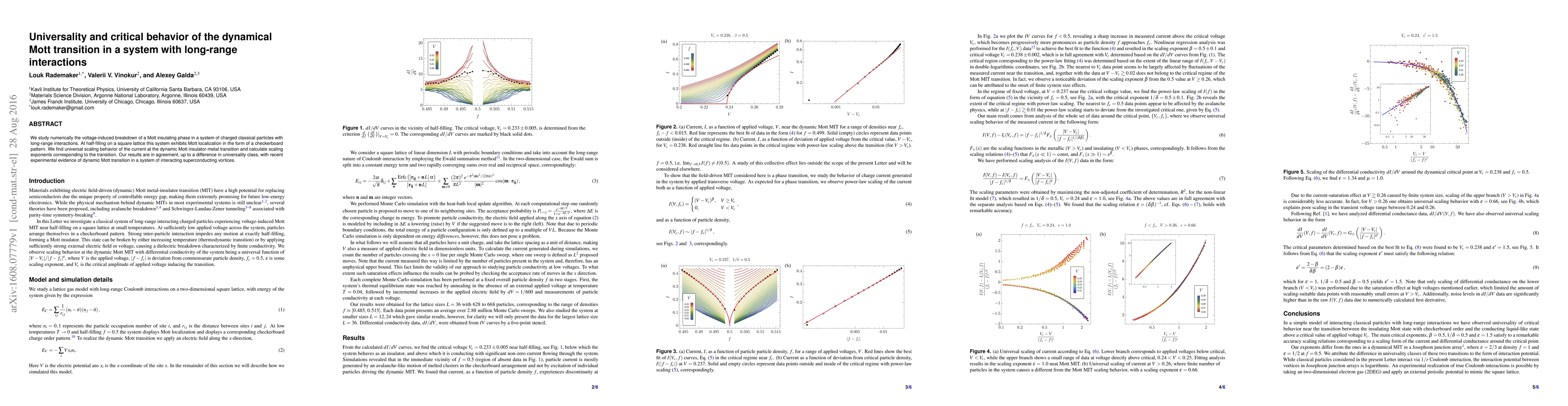 This paper numerically investigates the voltage-induced breakdown of a Mott insulating phase in a system of charged particles with long-range interactions, revealing universal scaling behavior and critical exponents at the dynamical Mott transition. The findings align with recent experimental observations of similar transitions in superconducting vortex systems.