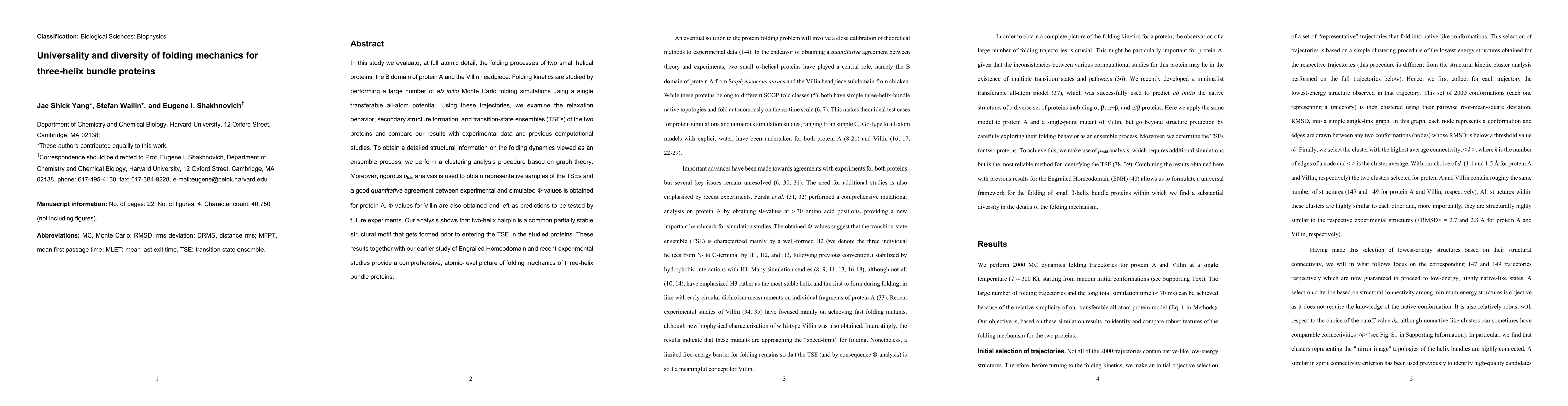 In this study we evaluate, at full atomic detail, the folding processes of two small helical proteins, the B domain of protein A and the Villin headpiece. Folding kinetics are studied by performing a large number of ab initio Monte Carlo folding simulations using a single transferable all-atom potential. Using these trajectories, we examine the relaxation behavior, secondary structure formation, and transition-state ensembles (TSEs) of the two proteins and compare our results with experimental data and previous computational studies. To obtain a detailed structural information on the folding dynamics viewed as an ensemble process, we perform a clustering analysis procedure based on graph theory. Moreover, rigorous pfold analysis is used to obtain representative samples of the TSEs and a good quantitative agreement between experimental and simulated Fi-values is obtained for protein A. Fi-values for Villin are also obtained and left as predictions to be tested by future experiments. Our analysis shows that two-helix hairpin is a common partially stable structural motif that gets formed prior to entering the TSE in the studied proteins. These results together with our earlier study of Engrailed Homeodomain and recent experimental studies provide a comprehensive, atomic-level picture of folding mechanics of three-helix bundle proteins.