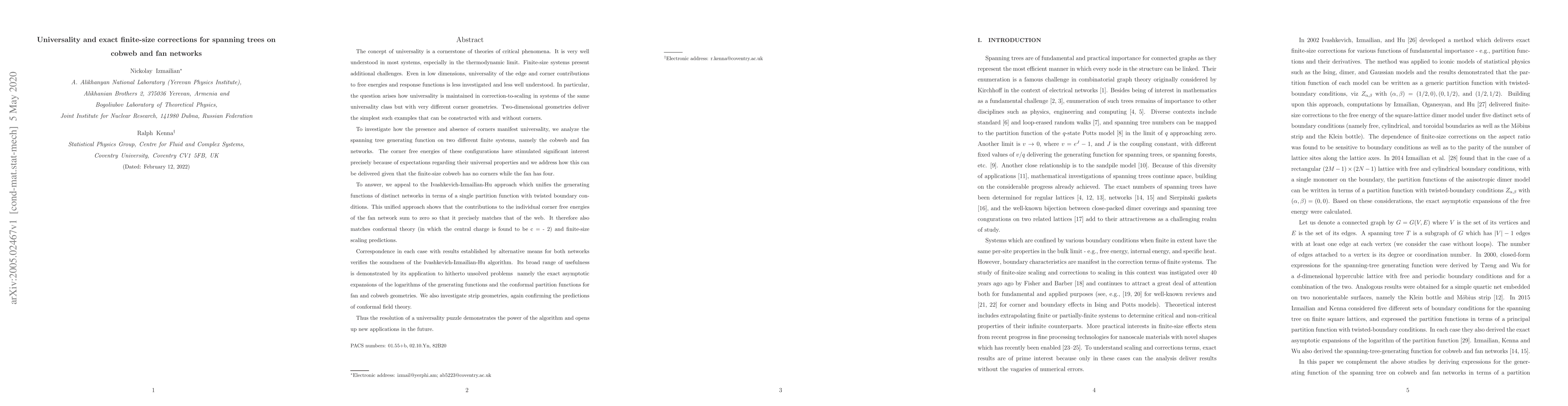 Universality is a cornerstone of theories of critical phenomena. It is well understood in most systems especially in the thermodynamic limit. Finite-size systems present additional challenges. Even in low dimensions, universality of the edge and corner contributions to free energies and response functions is less well understood. The question arises of how universality is maintained in correction-to-scaling in systems of the same universality class but with very different corner geometries. 2D geometries deliver the simplest such examples that can be constructed with and without corners. To investigate how the presence and absence of corners manifest universality, we analyze the spanning tree generating function on two finite systems, namely the cobweb and fan networks. We address how universality can be delivered given that the finite-size cobweb has no corners while the fan has four. To answer, we appeal to the Ivashkevich-Izmailian-Hu approach which unifies the generating functions of distinct networks in terms of a single partition function with twisted boundary conditions. This unified approach shows that the contributions to the individual corner free energies of the fan network sum to zero so that it precisely matches that of the web. Correspondence in each case with results established by alternative means for both networks verifies the soundness of the algorithm. Its range of usefulness is demonstrated by its application to hitherto unsolved problems-namely the exact asymptotic expansions of the logarithms of the generating functions and the conformal partition functions for fan and cobweb geometries. Thus, the resolution of a universality puzzle demonstrates the power of the algorithm and opens up new applications in the future.