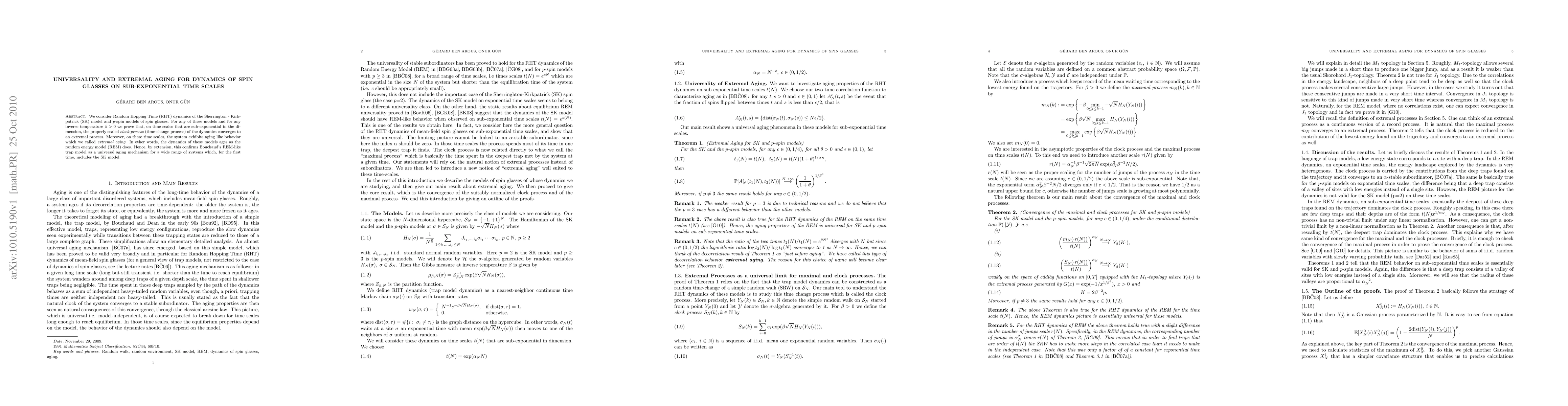 This paper proves that Random Hopping Time dynamics in spin glass models like the Sherrington-Kirkpatrick and p-spin models exhibit extremal aging behavior on sub-exponential time scales. The study confirms Bouchaud's REM-like trap model as a universal aging mechanism, extending its applicability to include the SK model.