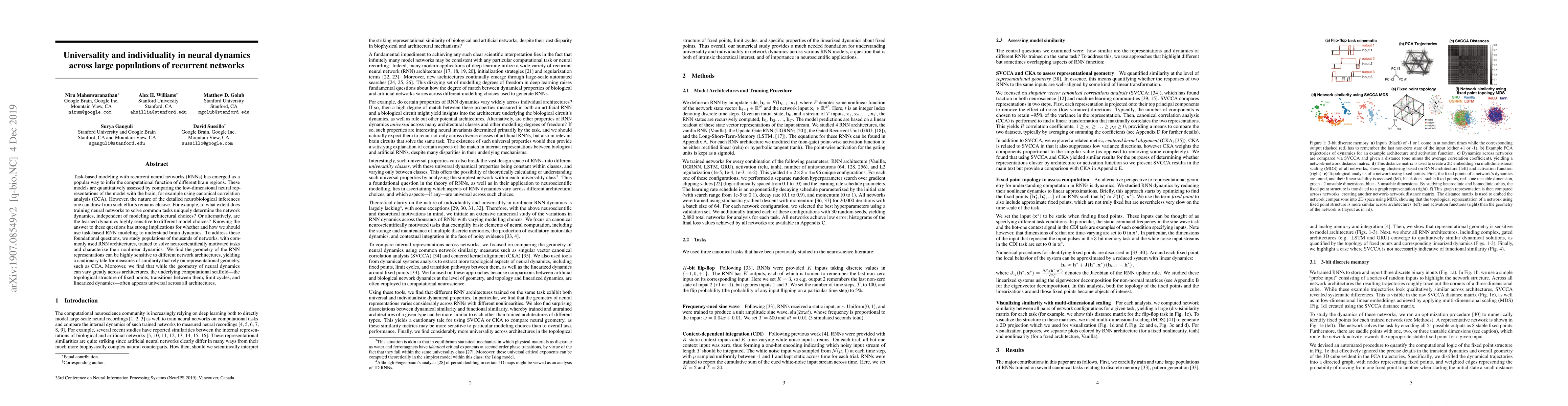 Task-based modeling with recurrent neural networks (RNNs) has emerged as a popular way to infer the computational function of different brain regions. These models are quantitatively assessed by comparing the low-dimensional neural representations of the model with the brain, for example using canonical correlation analysis (CCA). However, the nature of the detailed neurobiological inferences one can draw from such efforts remains elusive. For example, to what extent does training neural networks to solve common tasks uniquely determine the network dynamics, independent of modeling architectural choices? Or alternatively, are the learned dynamics highly sensitive to different model choices? Knowing the answer to these questions has strong implications for whether and how we should use task-based RNN modeling to understand brain dynamics. To address these foundational questions, we study populations of thousands of networks, with commonly used RNN architectures, trained to solve neuroscientifically motivated tasks and characterize their nonlinear dynamics. We find the geometry of the RNN representations can be highly sensitive to different network architectures, yielding a cautionary tale for measures of similarity that rely representational geometry, such as CCA. Moreover, we find that while the geometry of neural dynamics can vary greatly across architectures, the underlying computational scaffold---the topological structure of fixed points, transitions between them, limit cycles, and linearized dynamics---often appears universal across all architectures.