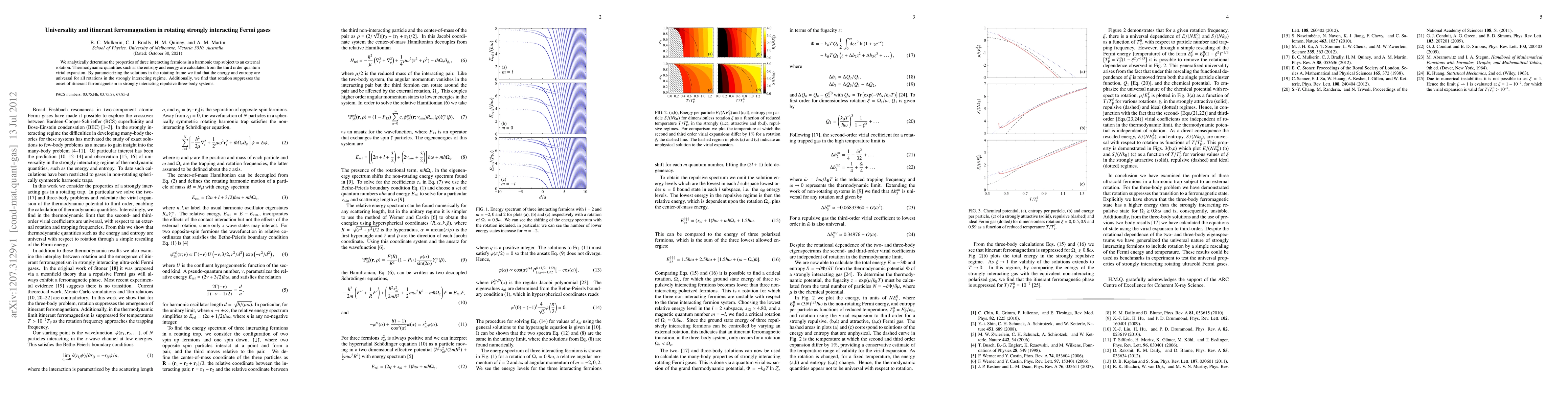 We analytically determine the properties of three interacting fermions in a harmonic trap subject to an external rotation. Thermodynamic quantities such as the entropy and energy are calculated from the third order quantum virial expansion. By parameterizing the solutions in the rotating frame we find that the energy and entropy are universal for all rotations in the strongly interacting regime. Additionally, we find that rotation suppresses the onset of itinerant ferromagnetism in strongly interacting repulsive three-body systems.