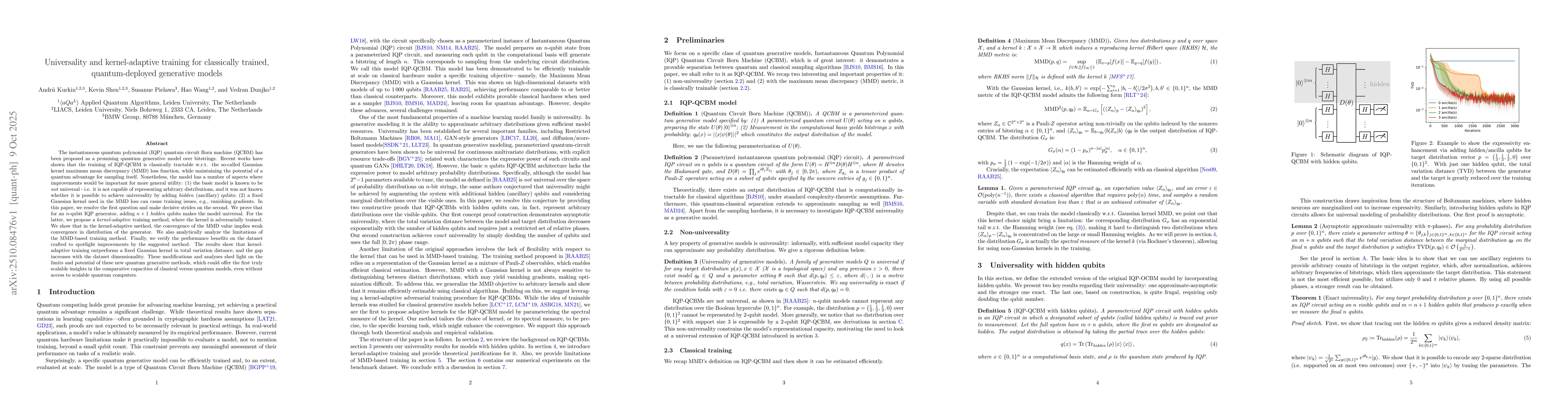 The instantaneous quantum polynomial (IQP) quantum circuit Born machine (QCBM) has been proposed as a promising quantum generative model over bitstrings. Recent works have shown that the training of IQP-QCBM is classically tractable w.r.t. the so-called Gaussian kernel maximum mean discrepancy (MMD) loss function, while maintaining the potential of a quantum advantage for sampling itself. Nonetheless, the model has a number of aspects where improvements would be important for more general utility: (1) the basic model is known to be not universal - i.e. it is not capable of representing arbitrary distributions, and it was not known whether it is possible to achieve universality by adding hidden (ancillary) qubits; (2) a fixed Gaussian kernel used in the MMD loss can cause training issues, e.g., vanishing gradients. In this paper, we resolve the first question and make decisive strides on the second. We prove that for an $n$-qubit IQP generator, adding $n + 1$ hidden qubits makes the model universal. For the latter, we propose a kernel-adaptive training method, where the kernel is adversarially trained. We show that in the kernel-adaptive method, the convergence of the MMD value implies weak convergence in distribution of the generator. We also analytically analyze the limitations of the MMD-based training method. Finally, we verify the performance benefits on the dataset crafted to spotlight improvements by the suggested method. The results show that kernel-adaptive training outperforms a fixed Gaussian kernel in total variation distance, and the gap increases with the dataset dimensionality. These modifications and analyses shed light on the limits and potential of these new quantum generative methods, which could offer the first truly scalable insights in the comparative capacities of classical versus quantum models, even without access to scalable quantum computers.