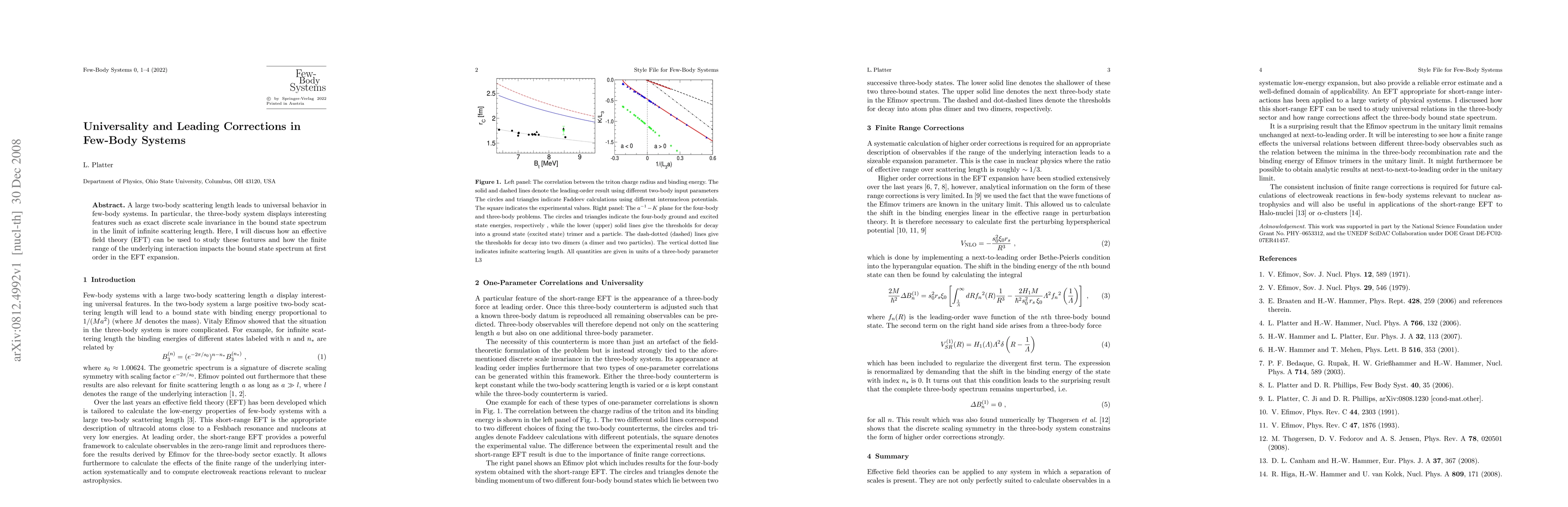 This paper explores the universal behavior in few-body systems with large two-body scattering lengths, focusing on the three-body system's exact discrete scale invariance. It utilizes effective field theory to analyze how finite interaction range affects the bound state spectrum at first-order corrections.
