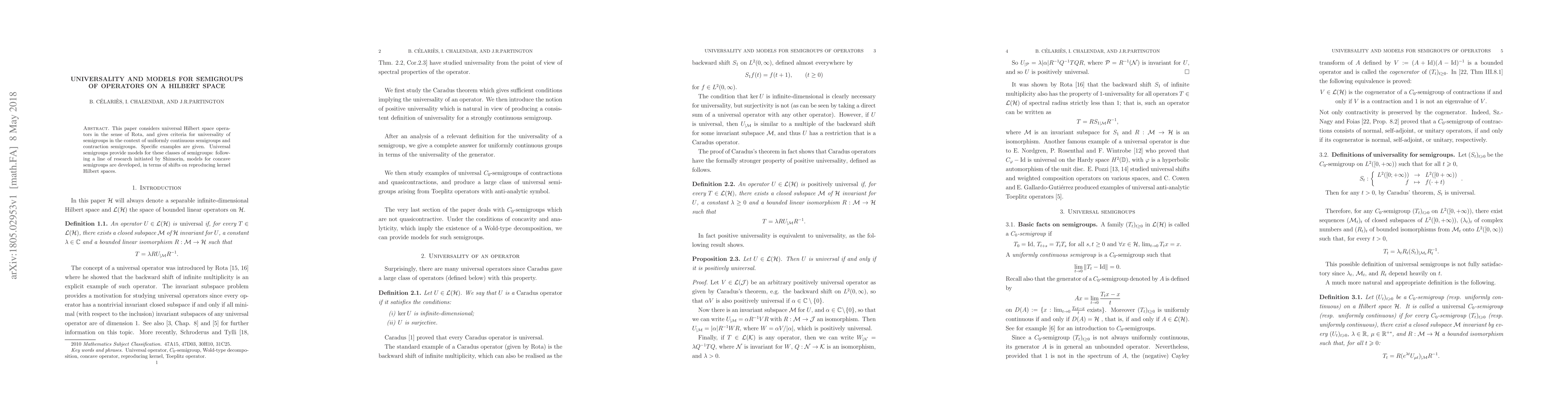 This paper considers universal Hilbert space operators in the sense of Rota, and gives criteria for universality of semigroups in the context of uniformly continuous semigroups and contraction semigroups. Specific examples are given. Universal semigroups provide models for these classes of semigroups: following a line of research initiated by Shimorin, models for concave semigroups are developed, in terms of shifts on reproducing kernel Hilbert spaces.