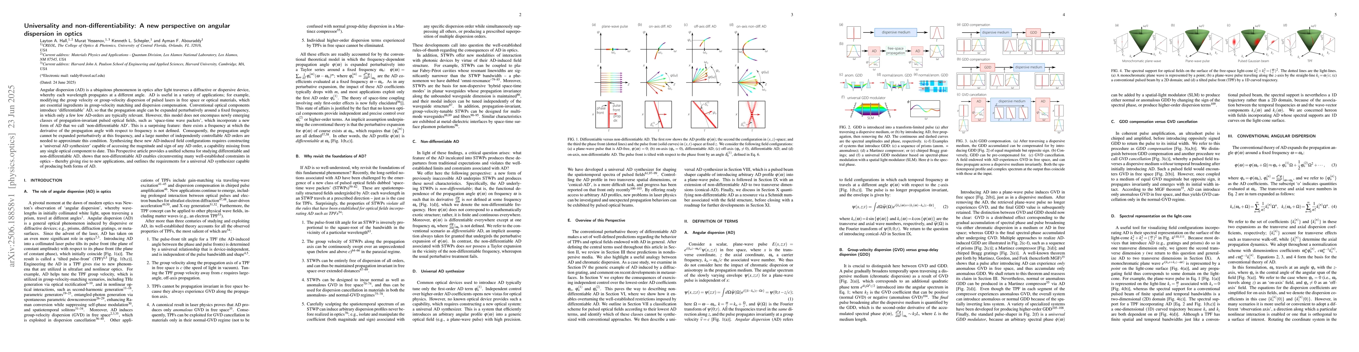 Angular dispersion (AD) is a ubiquitous phenomenon in optics after light traverses a diffractive or dispersive device, whereby each wavelength propagates at a different angle. AD is useful in a variety of applications; for example, modifying the group velocity or group-velocity dispersion of pulsed lasers in free space or optical materials, which are essential ingredients in group-velocity matching and dispersion compensation. Conventional optical components introduce `differentiable' AD, so that the propagation angle can be expanded perturbatively around a fixed frequency, in which only a few low AD-orders are typically relevant. However, this model does not encompass newly emerging classes of propagation-invariant pulsed optical fields, such as `space-time wave packets', which incorporate a new form of AD that we call `non-differentiable AD'. This is a surprising feature: there exists a frequency at which the derivative of the propagation angle with respect to frequency is not defined. Consequently, the propagation angle cannot be expanded perturbatively at this frequency, and a large number of independently controllable AD orders are needed to approximate this condition. Synthesizing these new AD-induced field configurations requires constructing a `universal AD synthesizer' capable of accessing the magnitude and sign of any AD order, a capability missing from any single optical component to date. This Perspective article provides a unified schema for studying differentiable and non-differentiable AD, shows that non-differentiable AD enables circumventing many well-established constraints in optics -- thereby giving rise to new applications, and outlines the requirements for a universal AD synthesizer capable of producing both forms of AD.