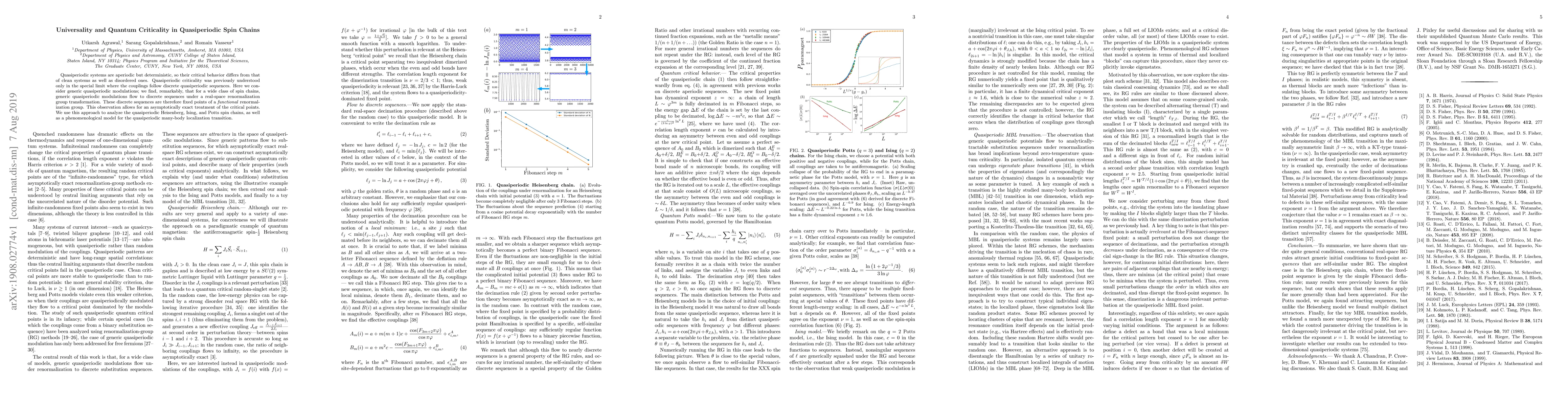 This paper explores the critical behavior of quasiperiodic spin chains, demonstrating that generic quasiperiodic modulations converge to discrete sequences under real-space renormalization, allowing for an exact treatment of their critical points. The study applies this method to analyze the quasiperiodic Heisenberg, Ising, and Potts spin chains, and a model for quasiperiodic many-body localization.