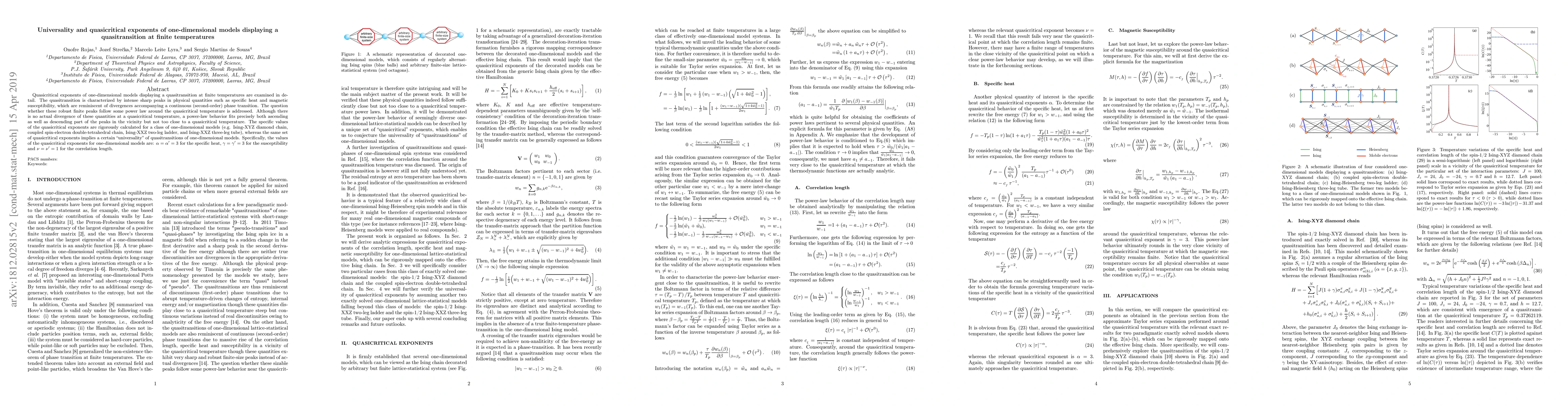 This research explores quasicritical exponents in one-dimensional models exhibiting quasitransitions at finite temperatures. Despite the absence of actual divergence, physical quantities like specific heat and magnetic susceptibility display power-law behavior near the quasicritical temperature. The study calculates specific values of quasicritical exponents for various models, revealing a 'universality' among one-dimensional models with exponents: $alpha=alpha'=3$ for specific heat, $gamma=gamma'=3$ for susceptibility, and $ u= u'=1$ for correlation length.
