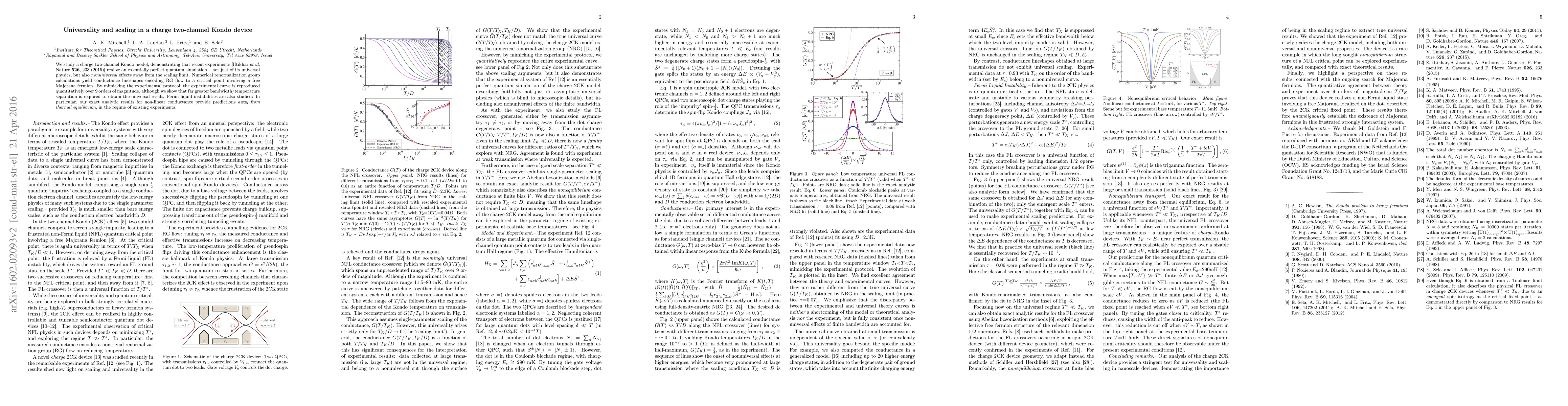 We study a charge two-channel Kondo model, demonstrating that recent experiments [Iftikhar et al, Nature 526, 233 (2015)] realize an essentially perfect quantum simulation -- not just of its universal physics, but also nonuniversal effects away from the scaling limit. Numerical renormalization group (NRG) calculations yield conductance lineshapes encoding RG flow to a critical point involving a free Majorana fermion. By mimicking the experimental protocol, the experimental curve is reproduced quantitatively over 9 orders of magnitude, although we show that far greater bandwidth/temperature separation is required to obtain the universal result. Fermi liquid instabilities are also studied: In particular, our exact analytic results for non-linear conductance provide predictions away from thermal equilibrium, in the regime of existing experiments.