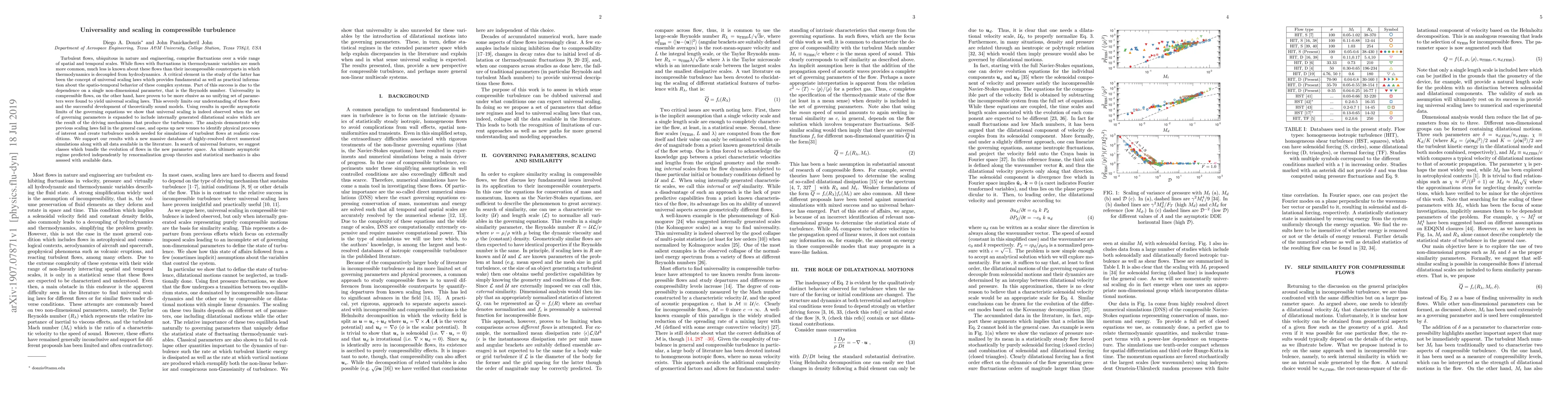 This paper explores the elusive universality and scaling in compressible turbulence, revealing that incorporating internally generated dilatational scales alongside the Reynolds number leads to observed universal scaling laws. The findings suggest new avenues for identifying key physical processes and developing turbulence models, supported by extensive direct numerical simulations and a comprehensive database.