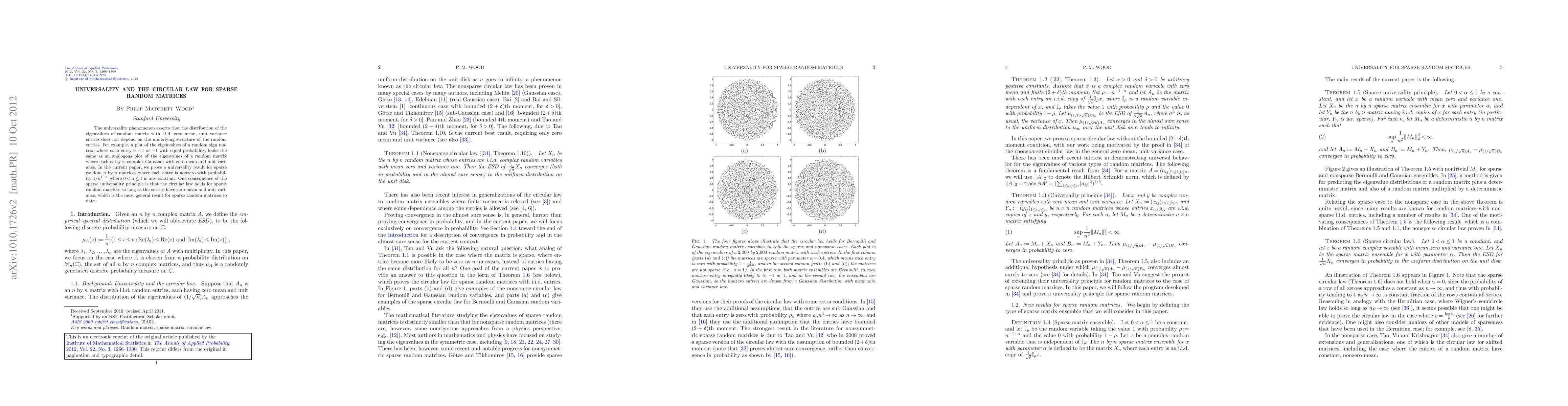 This paper proves a universality result for sparse random matrices, showing that their eigenvalue distributions are similar regardless of the specific structure of the entries. It establishes that the circular law applies to sparse matrices with zero mean and unit variance entries, providing the most general result to date.