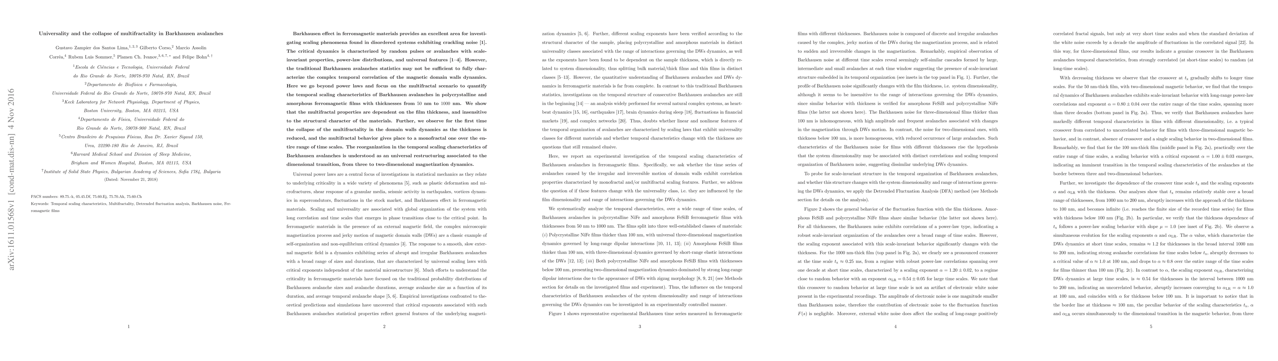 This paper investigates the multifractality of Barkhausen avalanches in ferromagnetic materials, demonstrating that multifractal properties depend on film thickness and collapse into a monofractal regime as thickness decreases. The transition signifies a universal shift from three to two-dimensional magnetization dynamics.