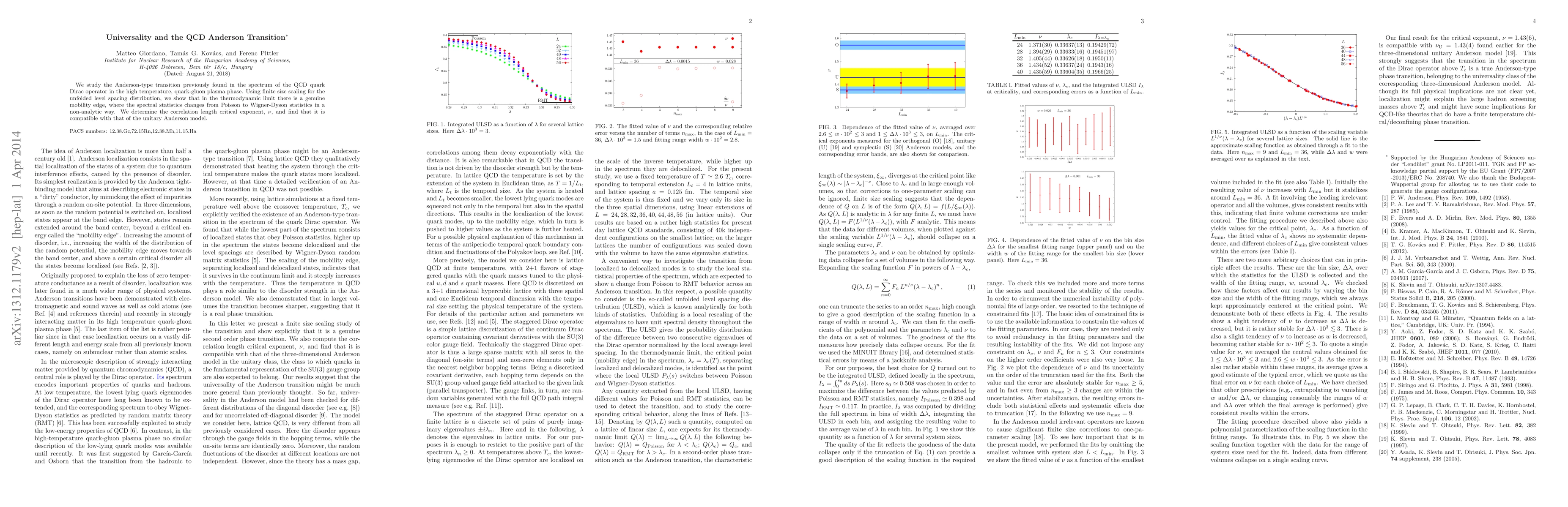 This study investigates the QCD Anderson transition in quark-gluon plasma, demonstrating a mobility edge in the thermodynamic limit where spectral statistics transition from Poisson to Wigner-Dyson. The correlation length critical exponent $\nu$ aligns with that of the unitary Anderson model, confirming the universality of this transition.