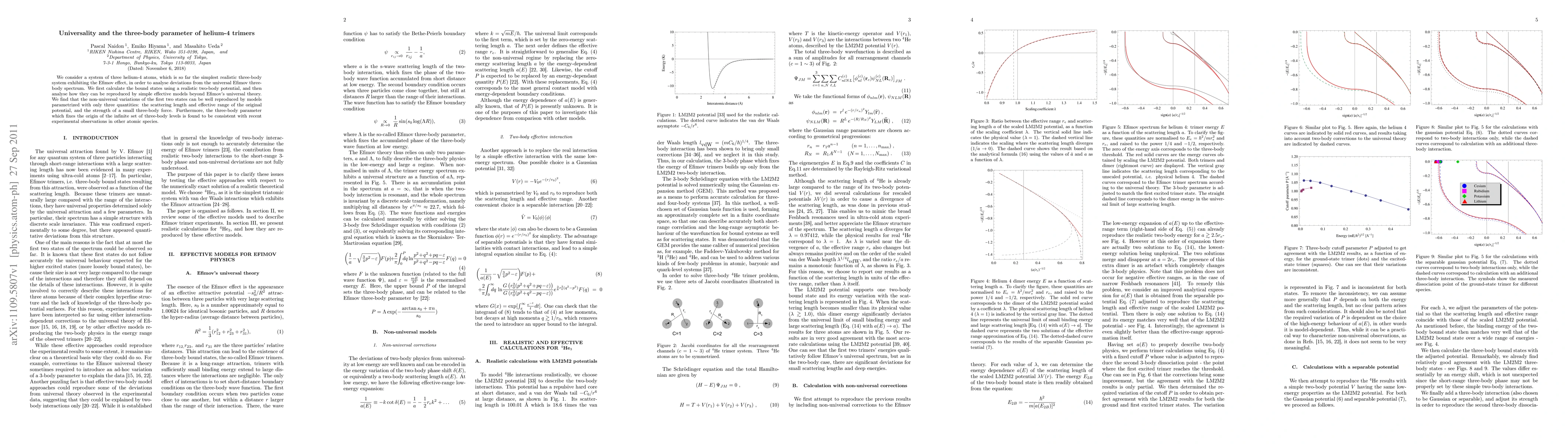 We consider a system of three helium-4 atoms, which is so far the simplest realistic three-body system exhibiting the Efimov effect, in order to analyse deviations from the universal Efimov three-body spectrum. We first calculate the bound states using a realistic two-body potential, and then analyse how they can be reproduced by simple effective models beyond Efimov's universal theory. We find that the non-universal variations of the first two states can be well reproduced by models parametrized with only three quantities: the scattering length and effective range of the original potential, and the strength of a small three-body force. Furthermore, the three-body parameter which fixes the origin of the infinite set of three-body levels is found to be consistent with recent experimental observations in other atomic species.