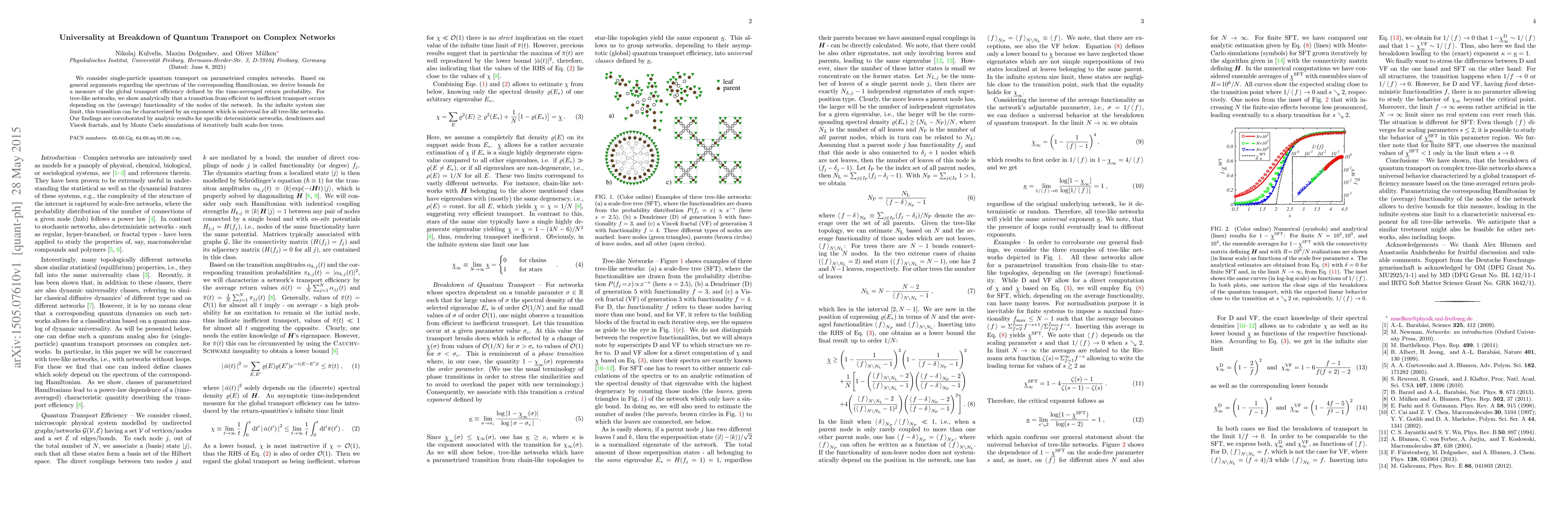 This paper investigates quantum transport efficiency on complex networks, deriving bounds for global transport efficiency based on Hamiltonian spectrum analysis. It reveals a universal transition exponent for tree-like networks, confirmed through analytic and simulation studies on specific network structures.