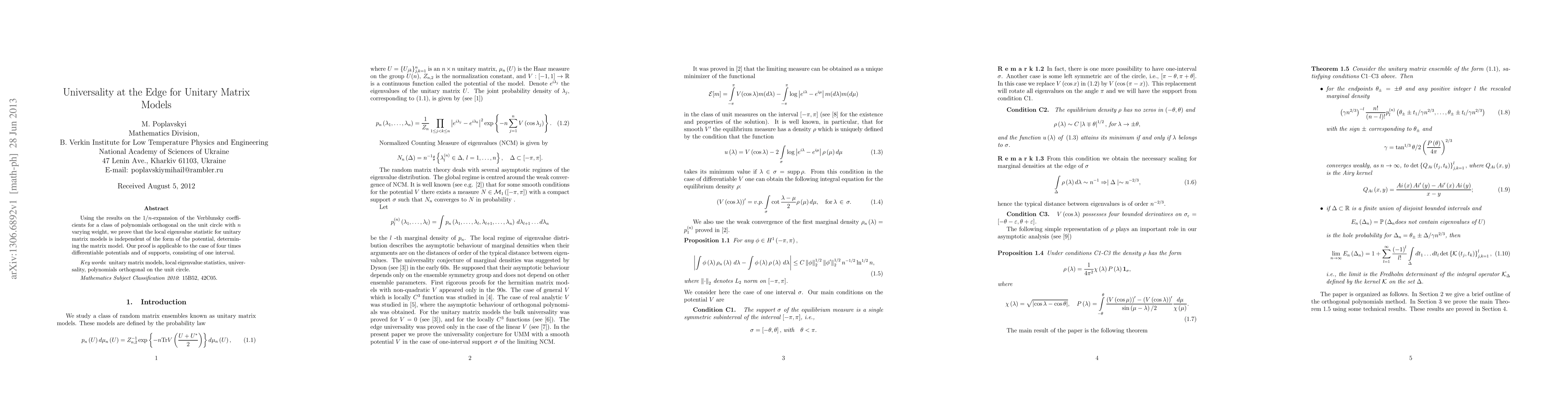 This paper demonstrates that the local eigenvalue statistics in unitary matrix models are universal and independent of the specific form of the potential, utilizing $1/n$-expansion results for orthogonal polynomials on the unit circle. This universality holds for four times differentiable potentials with single interval supports.