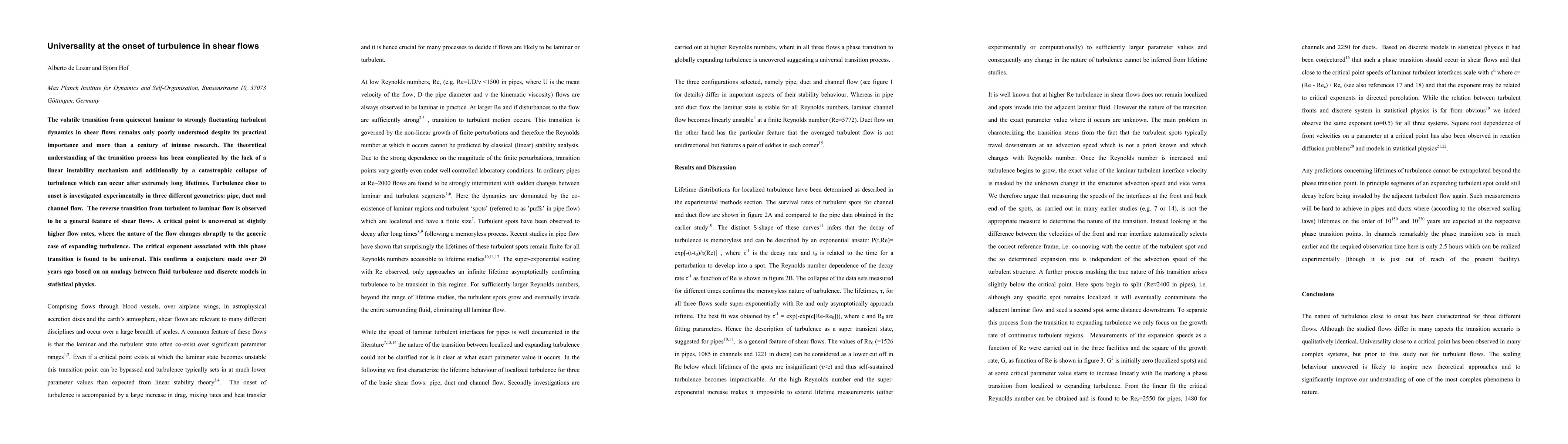 This study investigates the transition from laminar to turbulent dynamics in shear flows, revealing a universal critical exponent at the onset of turbulence across three geometries. The transition from turbulence to laminar flow is observed, confirming a long-standing conjecture linking fluid turbulence to statistical physics.