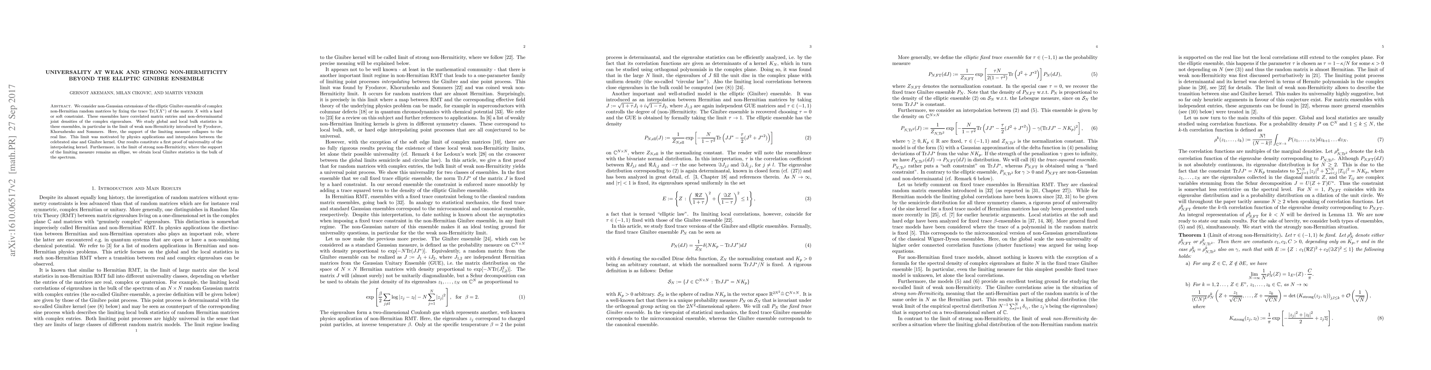 The paper presents detailed mathematical analysis and proofs of universality for interpolating kernels in weak and strong non-Hermiticity limits, as well as asymptotic analysis for fixed-trace ensembles.
