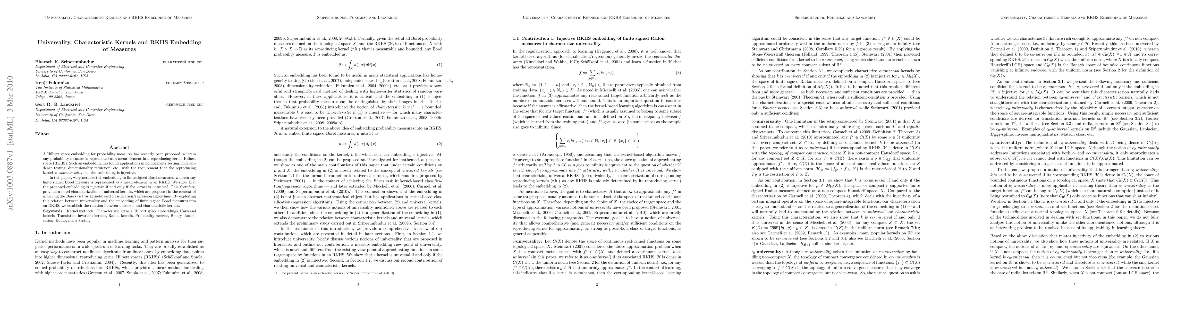 This paper generalizes the Hilbert space embedding of probability measures to finite signed Borel measures, showing that the embedding is injective if and only if the kernel is universal. It establishes a novel characterization of universal kernels and explores the relationship between universal and characteristic kernels.