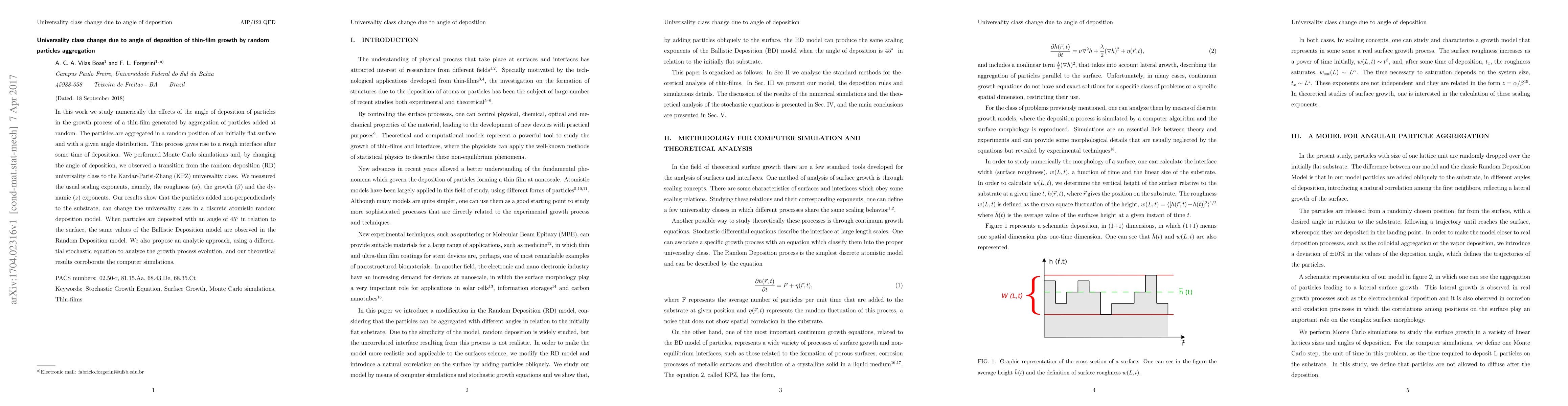 This paper investigates numerically how varying the angle of deposition affects the universality class in thin-film growth via random particle aggregation, observing a transition from RD to KPZ class, and proposes an analytic model to corroborate simulation results. The study finds that a deposition angle of $45^{\circ}$ aligns Random Deposition model behavior with Ballistic Deposition model.