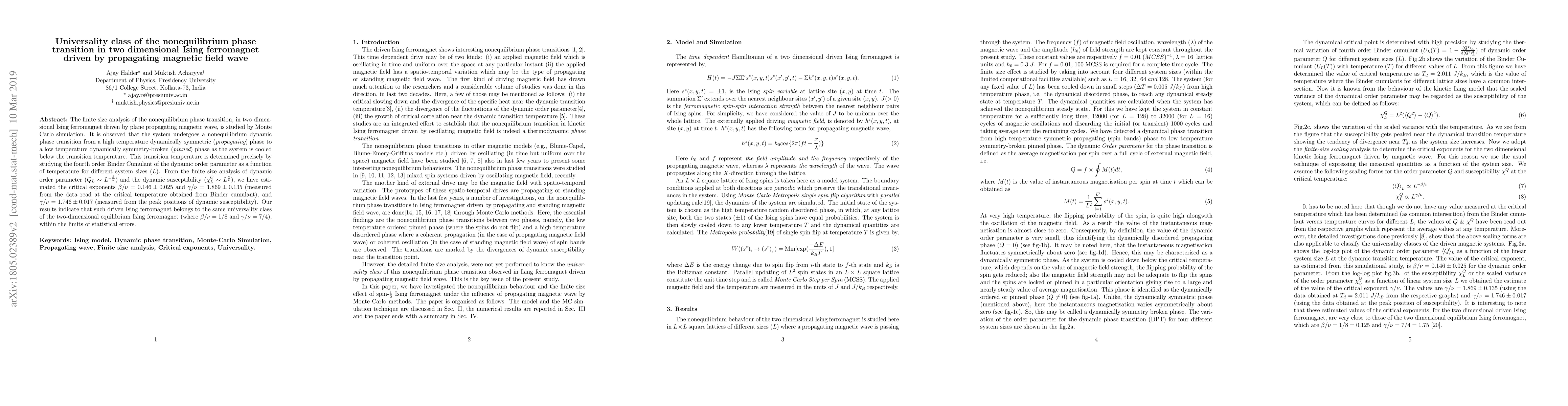 This study investigates the nonequilibrium phase transition in a two-dimensional Ising ferromagnet driven by a propagating magnetic field wave using Monte Carlo simulations. The system transitions from a dynamically symmetric phase to a symmetry-broken phase as it cools, with critical exponents $\beta/\nu$ and $\gamma/\nu$ matching those of the equilibrium Ising model, indicating the same universality class.