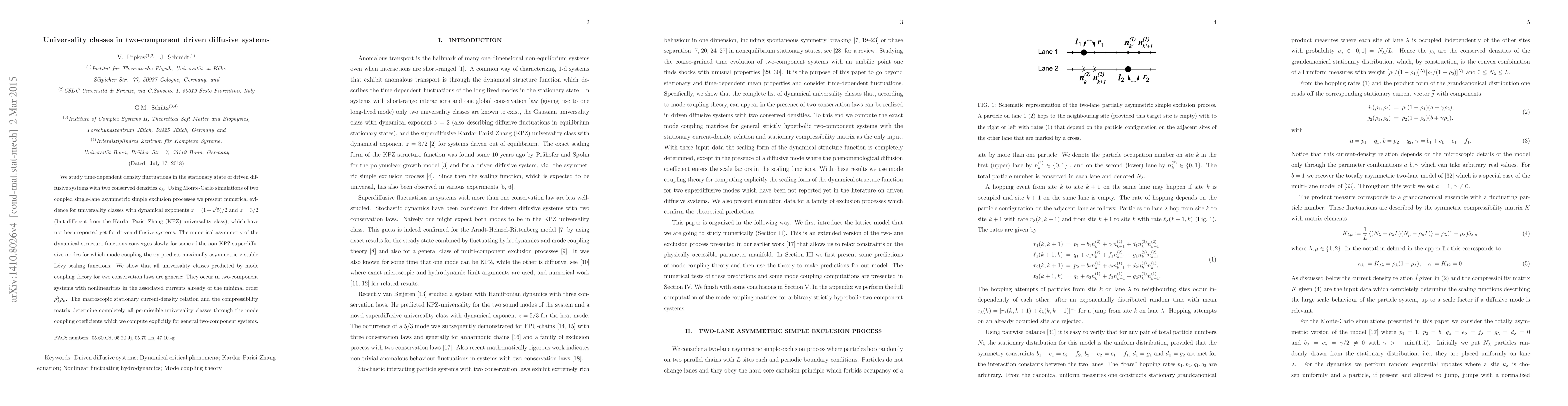 We study time-dependent density fluctuations in the stationary state of driven diffusive systems with two conserved densities $\rho_\lambda$. Using Monte-Carlo simulations of two coupled single-lane asymmetric simple exclusion processes we present numerical evidence for universality classes with dynamical exponents $z=(1+\sqrt{5})/2$ and $z=3/2$ (but different from the Kardar-Parisi-Zhang (KPZ) universality class), which have not been reported yet for driven diffusive systems. The numerical asymmetry of the dynamical structure functions converges slowly for some of the non-KPZ superdiffusive modes for which mode coupling theory predicts maximally asymmetric $z$-stable L\'evy scaling functions. We show that all universality classes predicted by mode coupling theory for two conservation laws are generic: They occur in two-component systems with nonlinearities in the associated currents already of the minimal order $\rho_\lambda^2\rho_\mu$. The macroscopic stationary current-density relation and the compressibility matrix determine completely all permissible universality classes through the mode coupling coefficients which we compute explicitly for general two-component systems.