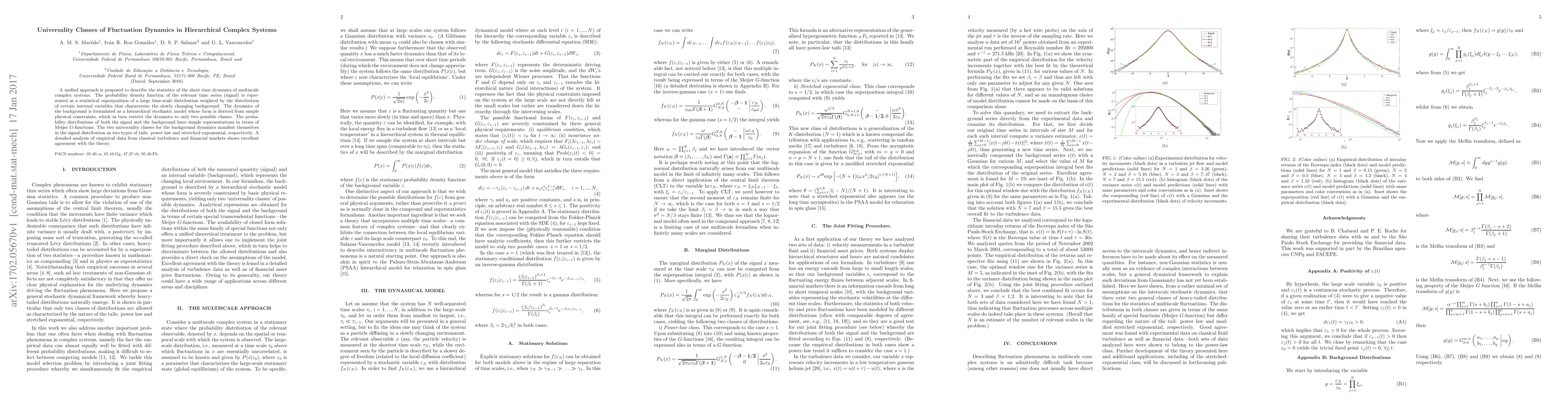 A unified approach is proposed to describe the statistics of the short time dynamics of multiscale complex systems. The probability density function of the relevant time series (signal) is represented as a statistical superposition of a large time-scale distribution weighted by the distribution of certain internal variables that characterize the slowly changing background. The dynamics of the background is formulated as a hierarchical stochastic model whose form is derived from simple physical constraints, which in turn restrict the dynamics to only two possible classes. The probability distributions of both the signal and the background have simple representations in terms of Meijer G-functions. The two universality classes for the background dynamics manifest themselves in the signal distribution as two types of tails: power law and stretched exponential, respectively. A detailed analysis of empirical data from classical turbulence and financial markets shows excellent agreement with the theory.