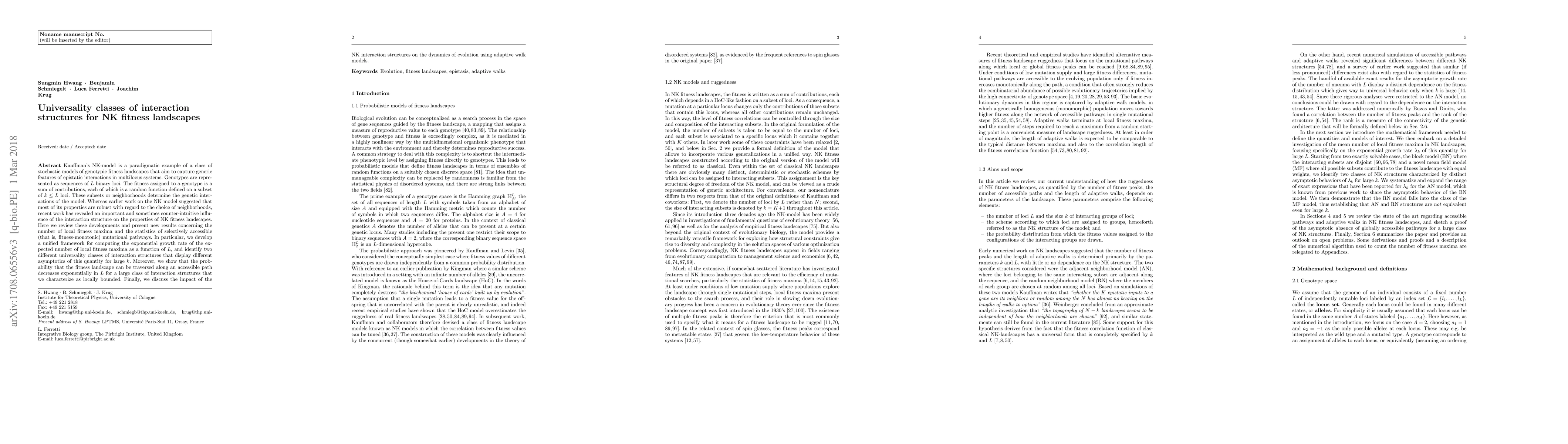 This paper reviews the influence of interaction structures in Kauffman's NK model on fitness landscapes, identifying two universality classes based on the asymptotic behavior of local fitness maxima and the probability of accessible mutational pathways. It develops a framework for computing these properties and discusses the implications for evolutionary dynamics.