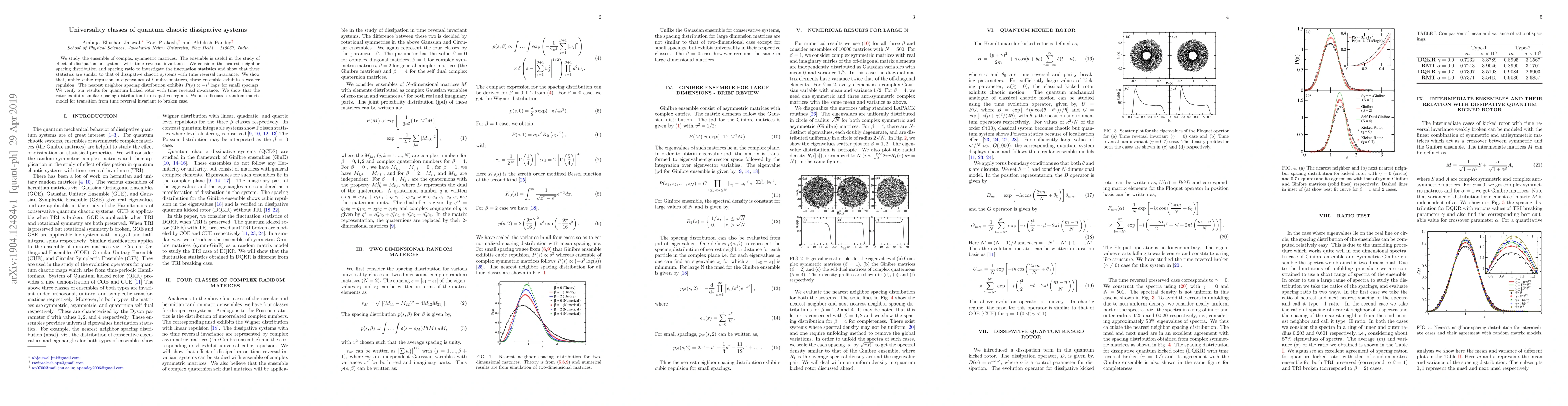 This paper investigates the universality classes of quantum chaotic dissipative systems using complex symmetric matrices, showing that they exhibit weaker repulsion compared to Ginibre matrices. The study finds that the nearest neighbor spacing distribution follows a $P(s) \propto -s^3 \log s$ pattern, verified through the quantum kicked rotor model, and discusses a random matrix model for transitions from time reversal invariant to broken symmetry.
