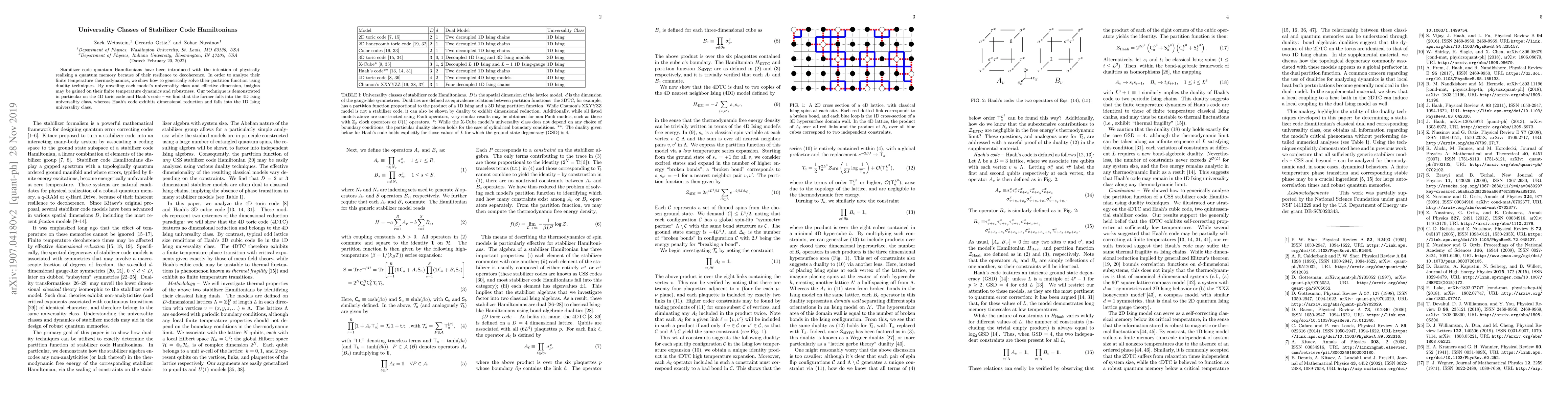 Stabilizer code quantum Hamiltonians have been introduced with the intention of physically realizing a quantum memory because of their resilience to decoherence. In order to analyze their finite temperature thermodynamics, we show how to generically solve their partition function using duality techniques. By unveiling each model's universality class and effective dimension, insights may be gained on their finite temperature dynamics and robustness. Our technique is demonstrated in particular on the 4D Toric Code and Haah's Code -- we find that the former falls into the 4D Ising universality class, whereas Haah's Code exhibits dimensional reduction and falls into the 1D Ising universality class.