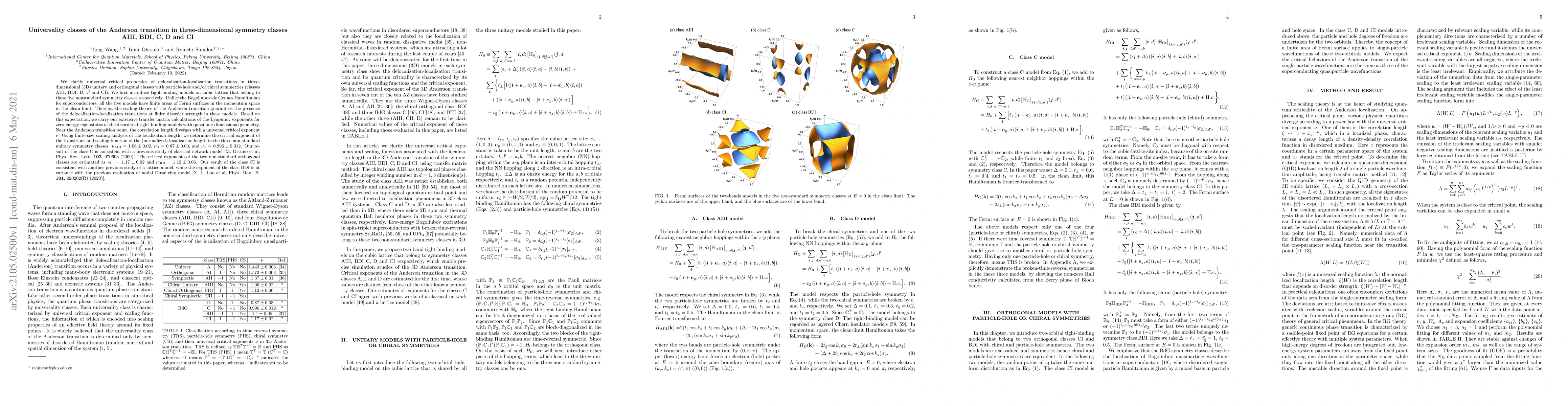 Researchers studied critical properties of delocalization-localization transitions in 3D unitary and orthogonal classes with particle-hole symmetries, finding universal critical exponents for the transitions in different symmetry classes.