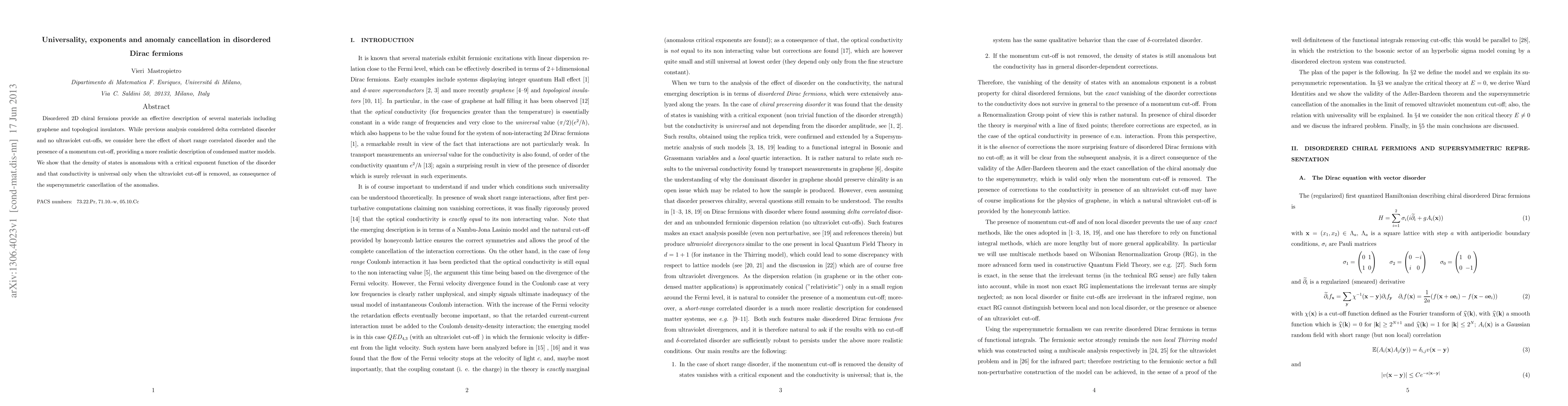 Disordered 2D chiral fermions provide an effective description of several materials including graphene and topological insulators. While previous analysis considered delta correlated disorder and no ultraviolet cut-offs, we consider here the effect of short range correlated disorder and the presence of a momentum cut-off, providing a more realistic description of condensed matter models. We show that the density of states is anomalous with a critical exponent function of the disorder and that conductivity is universal only when the ultraviolet cut-off is removed, as consequence of the supersymmetric cancellation of the anomalies.