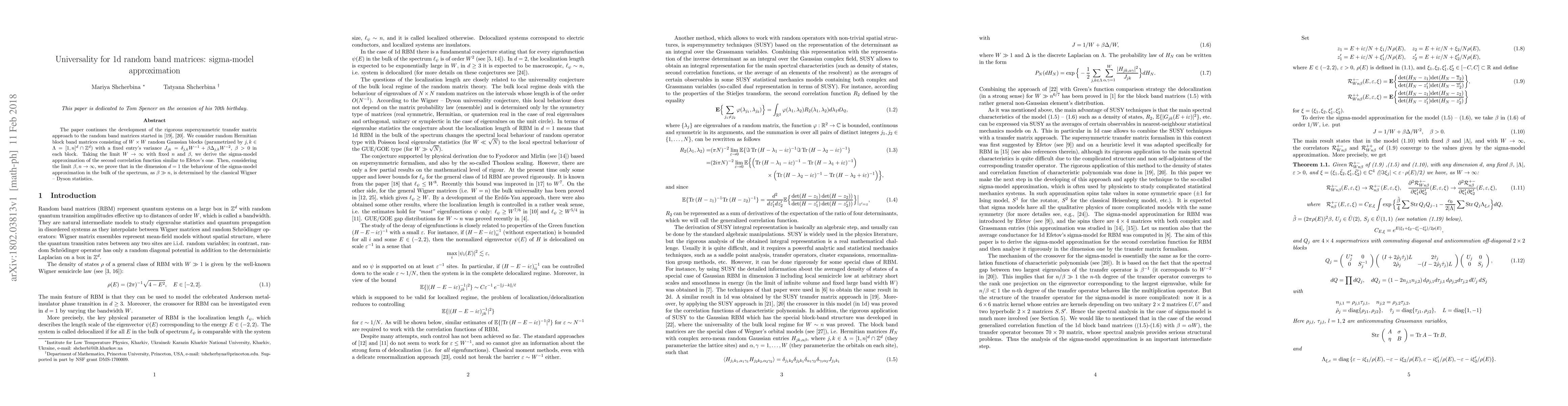 This paper develops the supersymmetric transfer matrix approach to study random Hermitian band matrices, deriving a sigma-model approximation for the second correlation function. It shows that in one dimension, the bulk spectrum behavior is governed by classical Wigner-Dyson statistics when the band width is large relative to the system size.