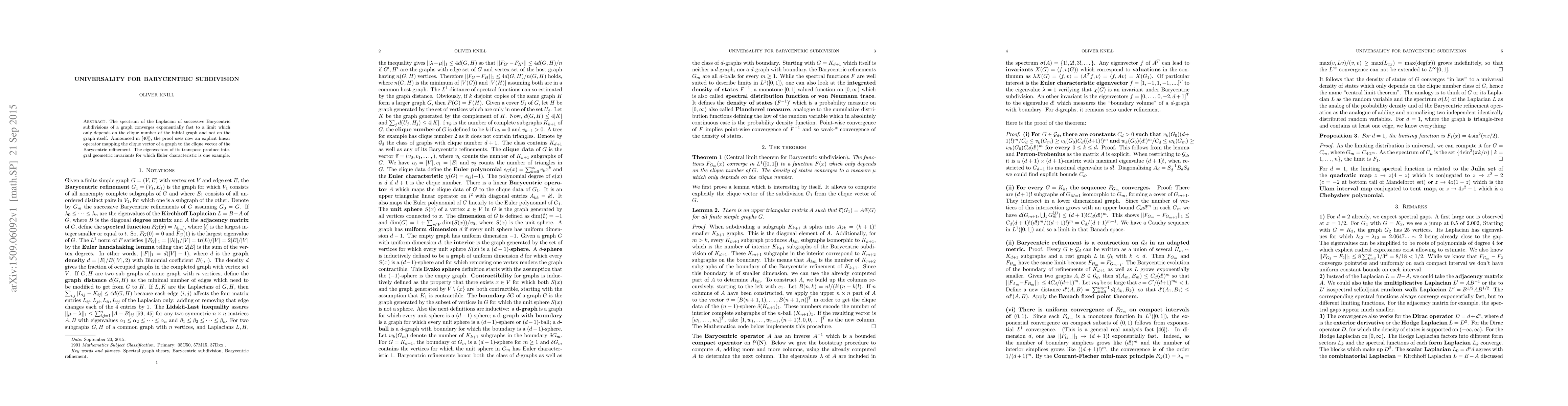 The spectrum of the Laplacian of successive Barycentric subdivisions of a graph converges exponentially fast to a limit which only depends on the clique number of the initial graph and not on the graph itself. The proof uses an explicit linear operator mapping the clique vector of a graph to the clique vector of the Barycentric refinement. The eigenvectors of its transpose produce integral geometric invariants for which Euler characteristic is one example.