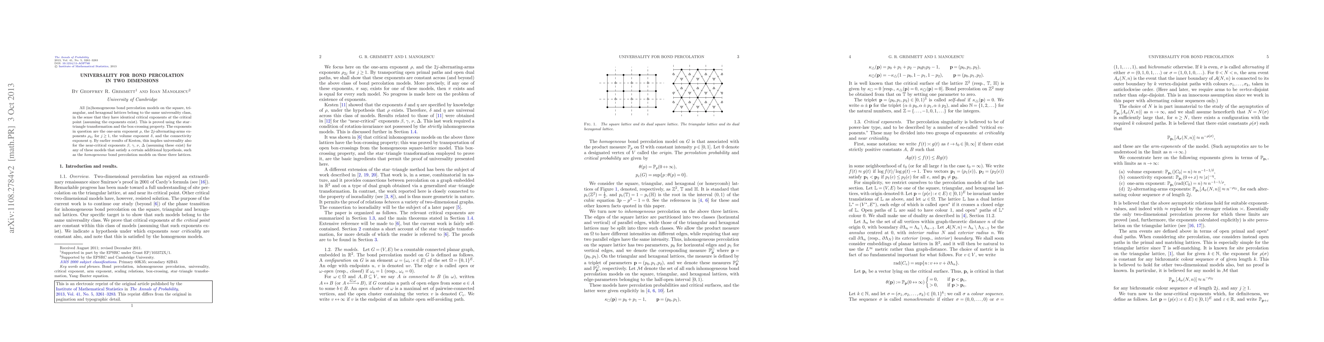 This paper proves that all inhomogeneous bond percolation models on square, triangular, and hexagonal lattices share identical critical exponents, demonstrating universality. The star-triangle transformation and box-crossing property are used to establish this, covering exponents like $\rho$, $\rho_{2j}$, $\delta$, and $\eta$.