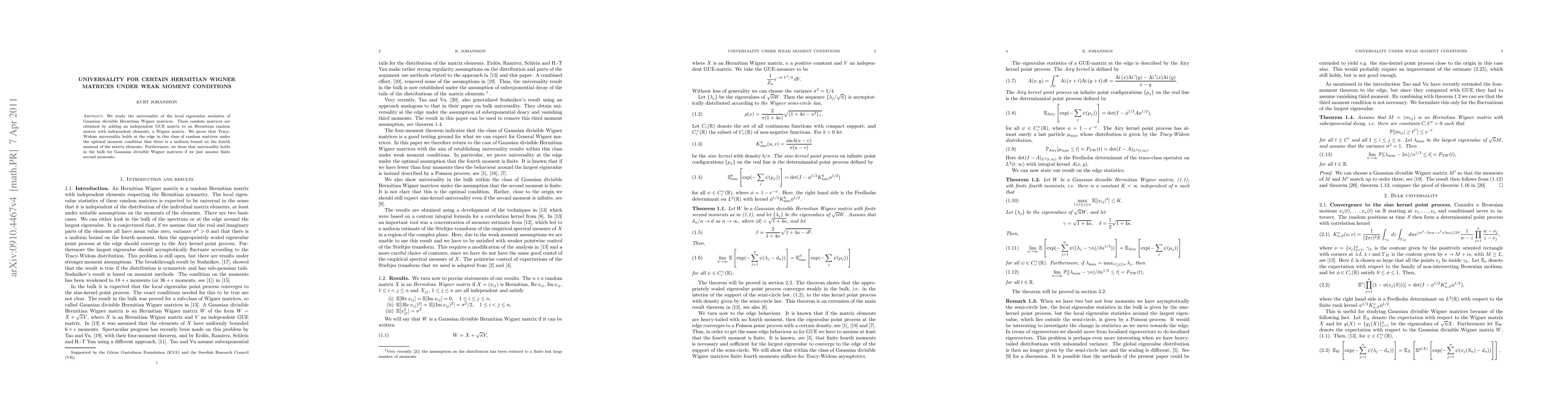 Summary: This research demonstrates the Tracy-Widom universality at the edge and in the bulk for Gaussian divisible Hermitian Wigner matrices under optimal and finite moment conditions, respectively, highlighting the consistent statistical behavior of eigenvalues across different matrix ensembles.