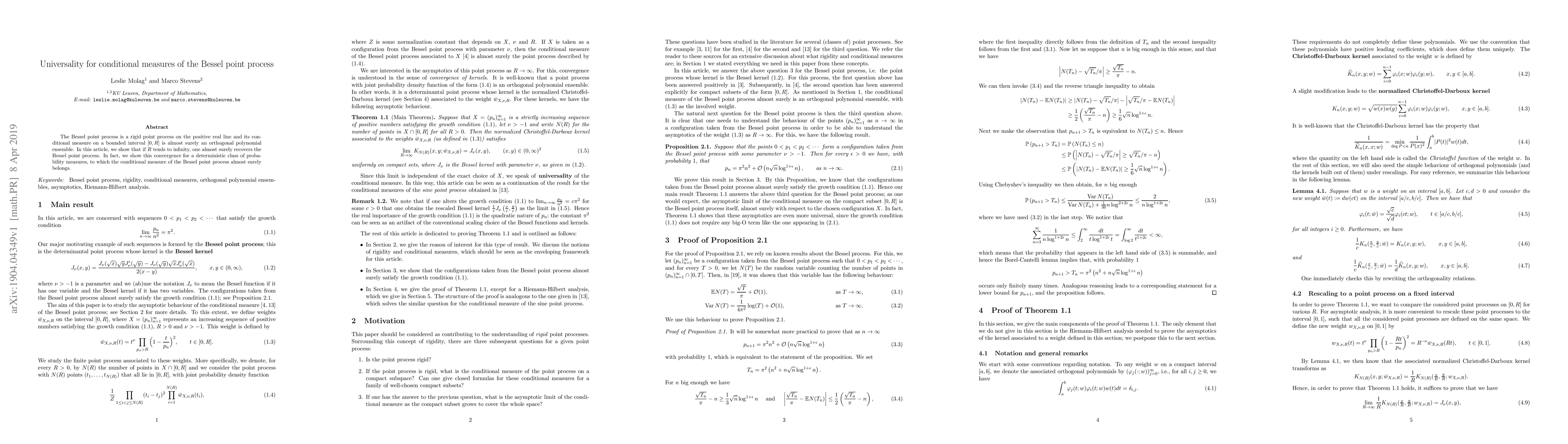 The Bessel point process is a rigid point process on the positive real line and its conditional measure on a bounded interval $[0,R]$ is almost surely an orthogonal polynomial ensemble. In this article, we show that if $R$ tends to infinity, one almost surely recovers the Bessel point process. In fact, we show this convergence for a deterministic class of probability measures, to which the conditional measure of the Bessel point process almost surely belongs.