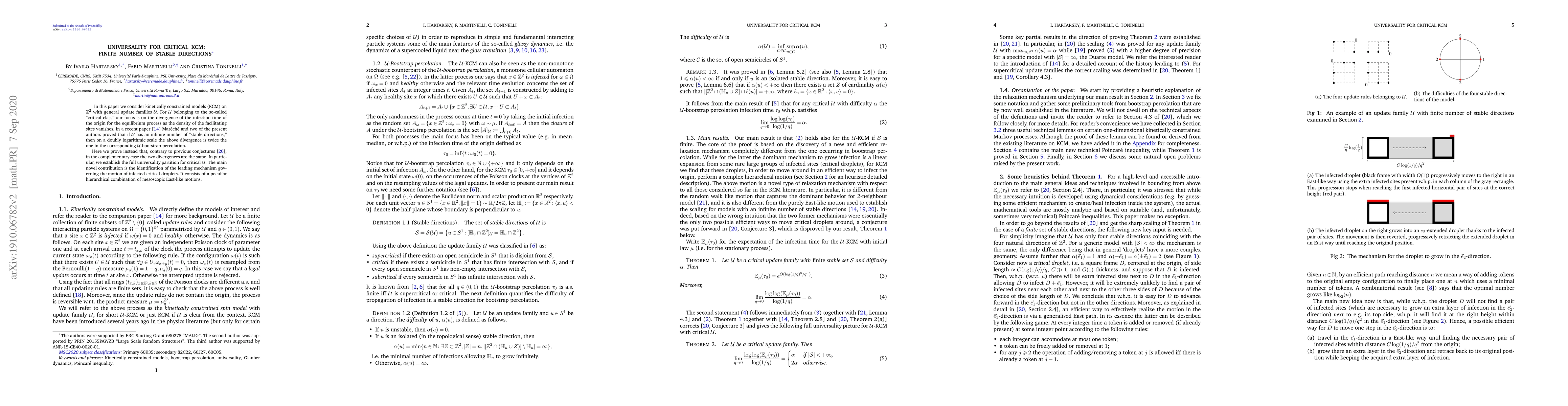 In this paper we consider kinetically constrained models (KCM) on $\mathbb Z^2$ with general update families $\mathcal U$. For $\mathcal U$ belonging to the so-called "critical class" our focus is on the divergence of the infection time of the origin for the equilibrium process as the density of the facilitating sites vanishes. In a recent paper Mar\^ech\'e and two of the present authors proved that if $\mathcal U$ has an infinite number of "stable directions", then on a doubly logarithmic scale the above divergence is twice the one in the corresponding $\mathcal U$-bootstrap percolation. Here we prove instead that, contrary to previous conjectures, in the complementary case the two divergences are the same. In particular, we establish the full universality partition for critical $\mathcal U$. The main novel contribution is the identification of the leading mechanism governing the motion of infected critical droplets. It consists of a peculiar hierarchical combination of mesoscopic East-like motions.