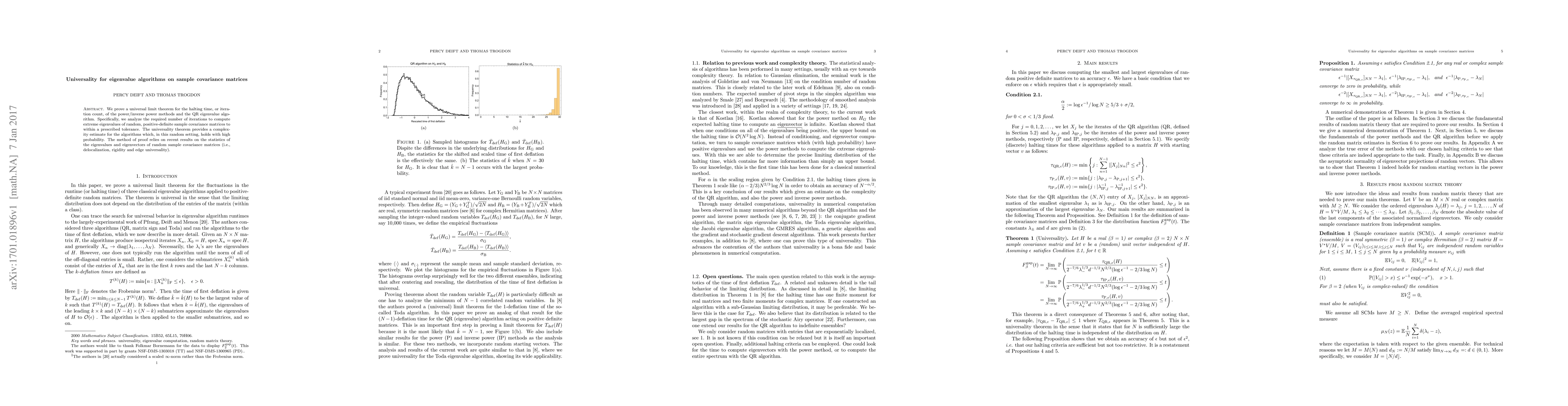 We prove a universal limit theorem for the halting time, or iteration count, of the power/inverse power methods and the QR eigenvalue algorithm. Specifically, we analyze the required number of iterations to compute extreme eigenvalues of random, positive-definite sample covariance matrices to within a prescribed tolerance. The universality theorem provides a complexity estimate for the algorithms which, in this random setting, holds with high probability. The method of proof relies on recent results on the statistics of the eigenvalues and eigenvectors of random sample covariance matrices (i.e., delocalization, rigidity and edge universality).