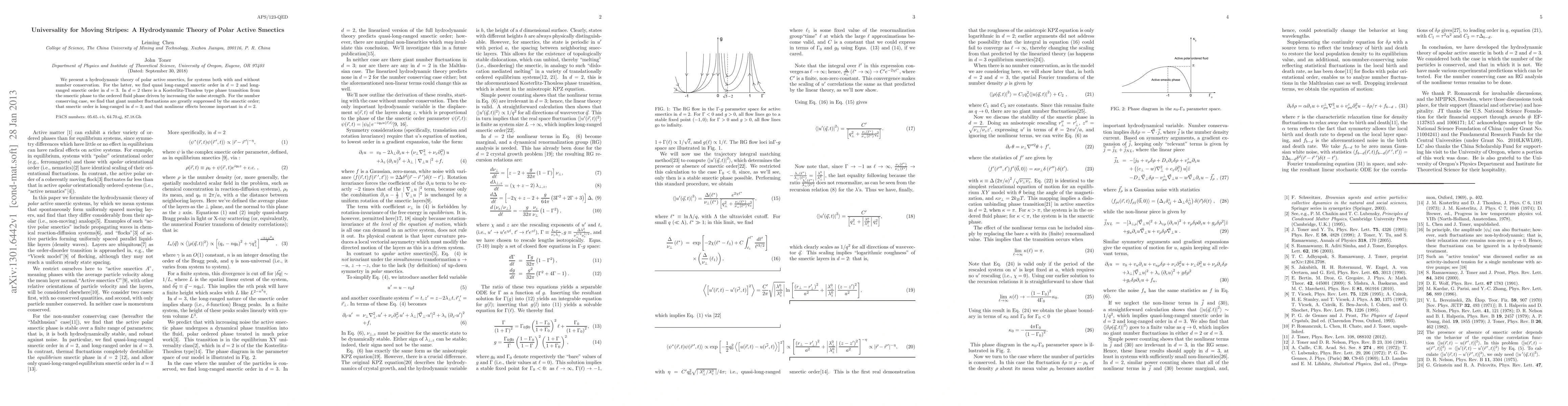 This paper develops a hydrodynamic theory for polar active smectics, identifying quasi long-ranged order in 2D and long-ranged order in 3D, with a Kosterlitz-Thouless transition in 2D. It also finds that smectic order suppresses giant number fluctuations and nonlinear effects become significant in 2D.