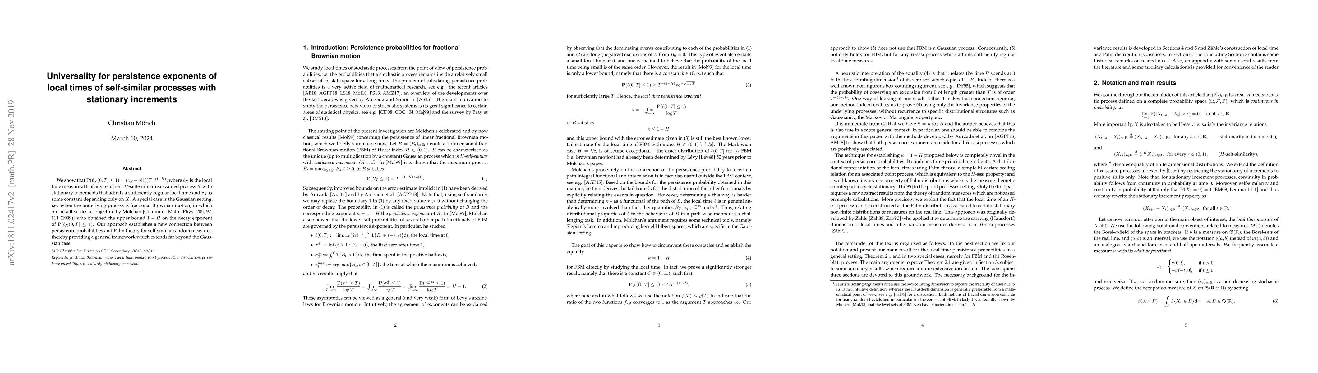 We show that $\mathbb{P} ( \ell_X(0,T] \leq 1)=(c_X+o(1))T^{-(1-H)}$, where $\ell_X$ is the local time measure at $0$ of any recurrent $H$-self-similar real-valued process $X$ with stationary increments that admits a sufficiently regular local time and $c_X$ is some constant depending only on $X$. A special case is the Gaussian setting, i.e. when the underlying process is fractional Brownian motion, in which our result settles a conjecture by Molchan [Commun. Math. Phys. 205, 97-111 (1999)] who obtained the upper bound $1-H$ on the decay exponent of $\mathbb{P} ( \ell_X(0,T] \leq 1)$. Our approach establishes a new connection between persistence probabilities and Palm theory for self-similar random measures, thereby providing a general framework which extends far beyond the Gaussian case.