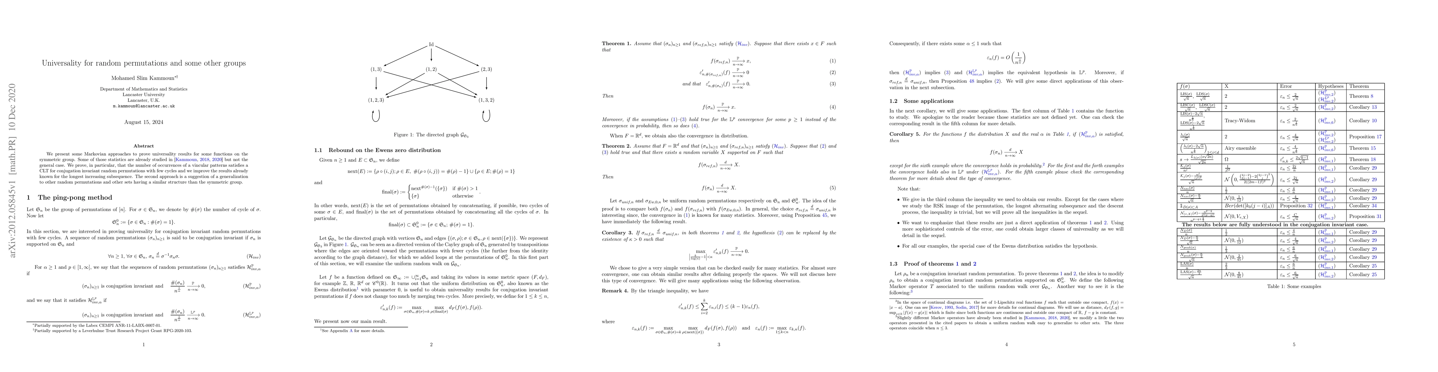 We present some Markovian approaches to prove universality results for some functions on the symmetric group. Some of those statistics are already studied in [Kammoun, 2018, 2020] but not the general case. We prove, in particular, that the number of occurrences of a vincular patterns satisfies a CLT for conjugation invariant random permutations with few cycles and we improve the results already known for the longest increasing subsequence. The second approach is a suggestion of a generalization to other random permutations and other sets having a similar structure than the symmetric group.