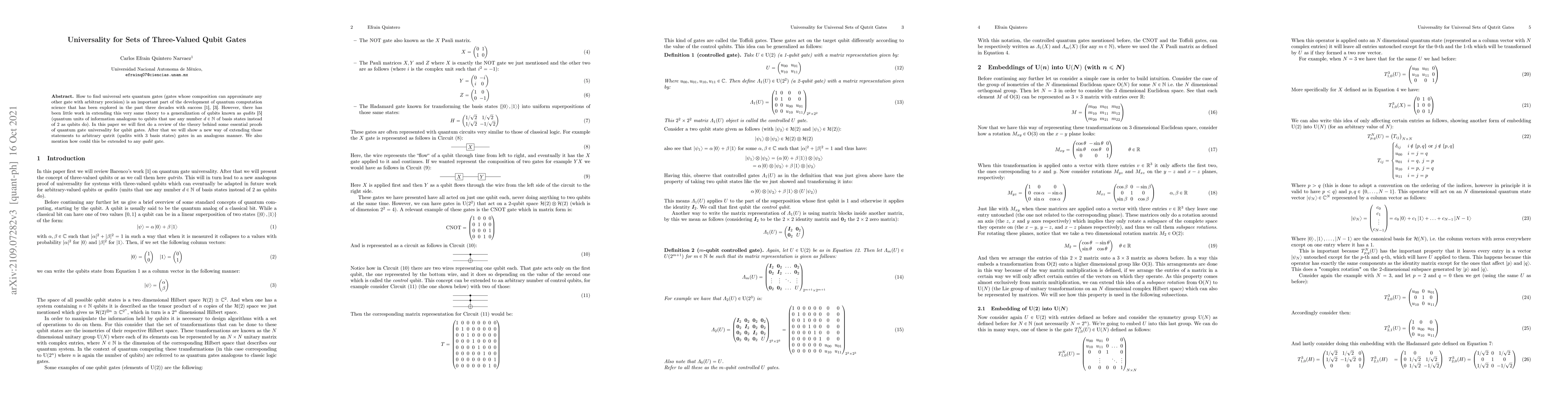 How to find universal sets quantum gates (gates whose composition can form any othergate within a given range) is an important part of the development of quantum computation science that has been explored in the past with success. However, there has not been much development in extending this very same theory to a generalization of qubits known as quregisters or as we call them here qunits (quantum units of information analogous to qubits that use any natural number n of basis states instead of 2 as qubits do). In this paper we will first do a review of the theory behind some essential proofs of quantum gate universality for qubit gates. After that we will show a new way of extending those statements to arbitrary qutrit gates in an analogous manner.
