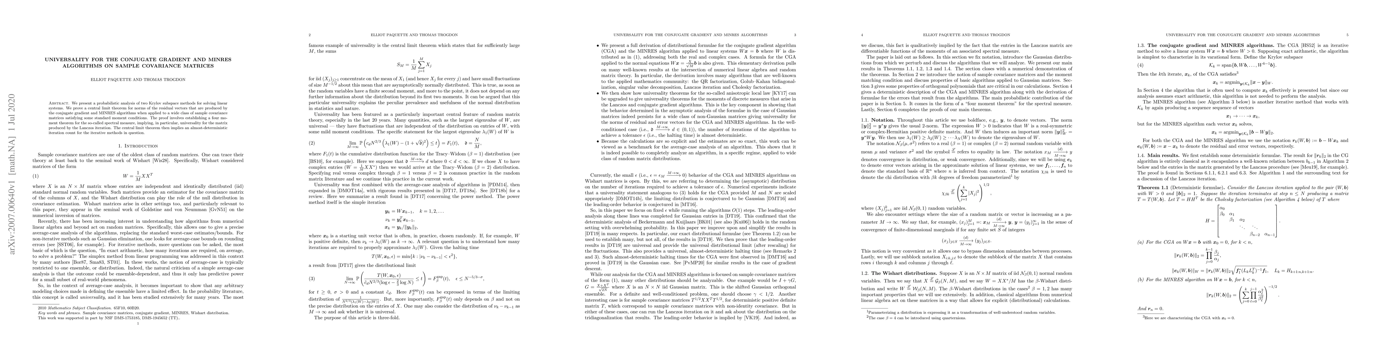 This paper proves a central limit theorem for the norms of residual vectors from the conjugate gradient and MINRES algorithms applied to sample covariance matrices, demonstrating universality and an almost-deterministic iteration count through a four moment theorem for the spectral measure.